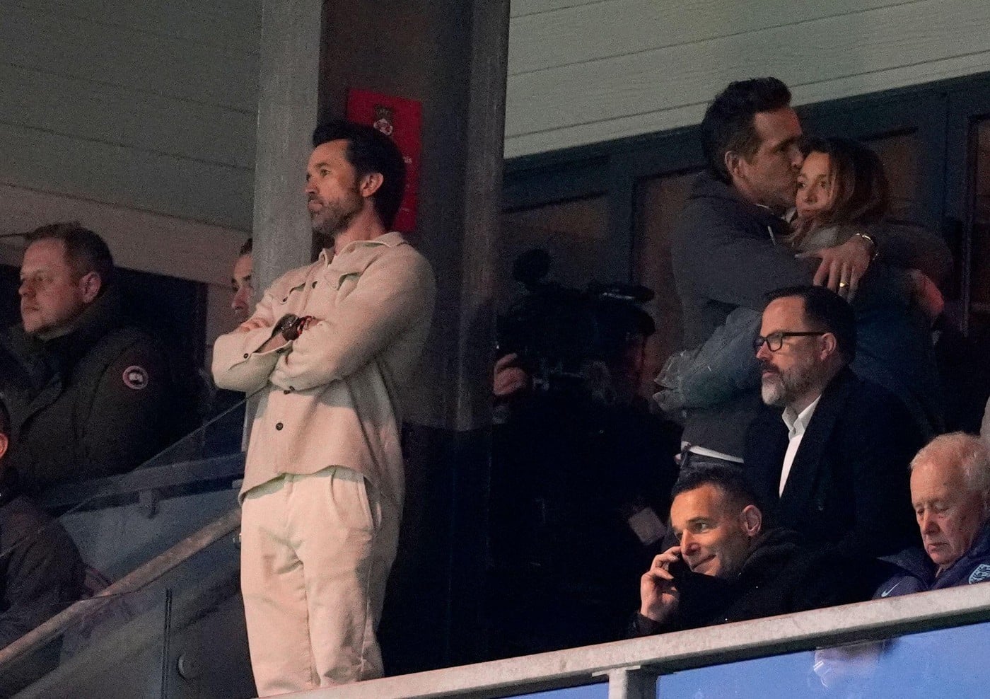 Wrexham co-owner Rob Mac (left) as co-owner Ryan Reynolds (second right) kisses his wife Blake Lively (right) in the stands ahead of the Emirates FA Cup fifth round match at SToK Racecourse, Wrexham. Picture date: Saturday March 7, 2026.