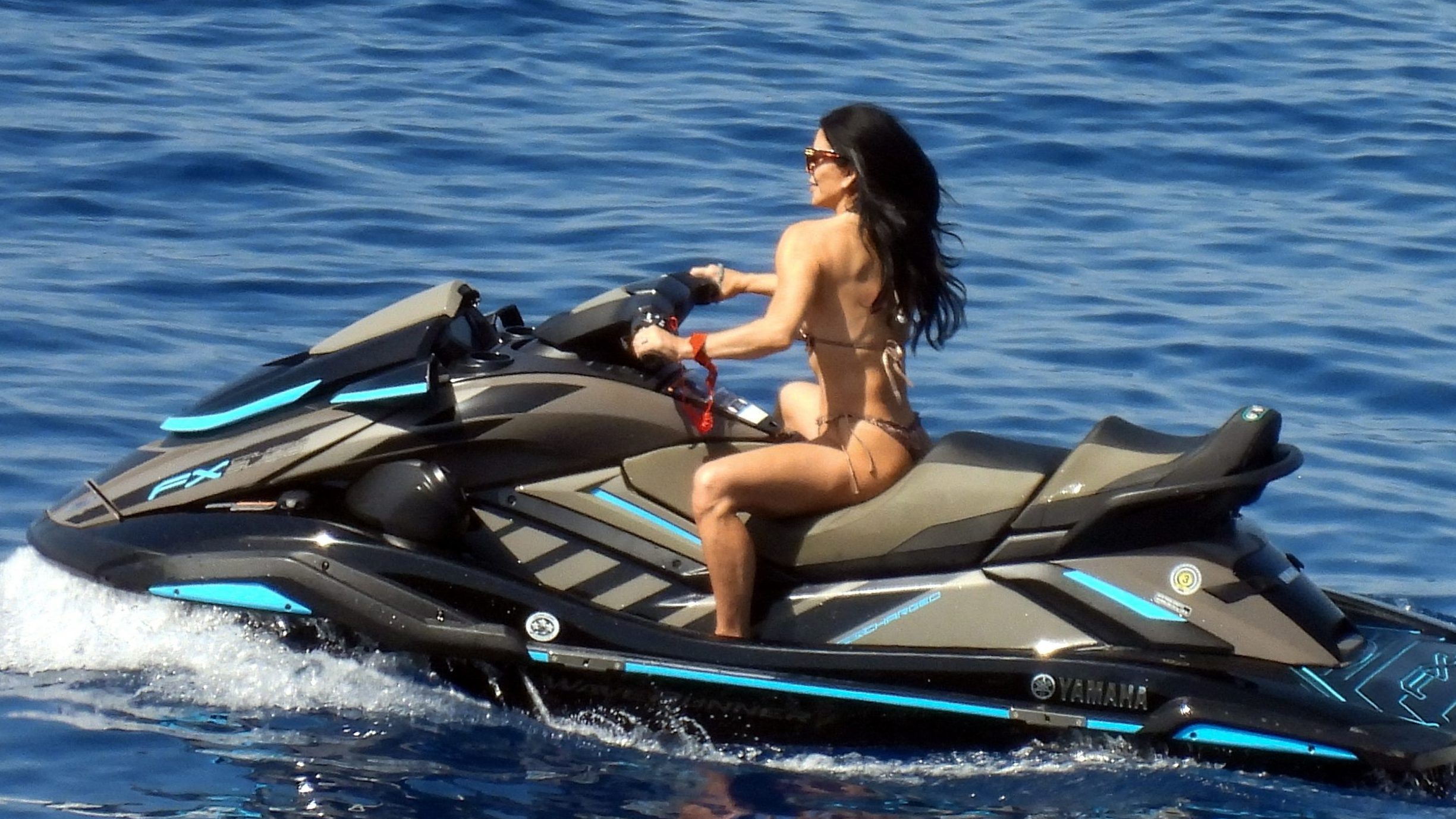EXCLUSIVE: Lauren Sanchez rocks a tiny gold bikini as she and billionaire fiance Jeff Bezos ride jet skis on the Aegean Sea in Greece. The 54-year-old stunner showed off her ultra fit figure in the metallic swimsuit, choosing to go without a life jacket for the excursion. Her 60-year-old beau put safety first as he followed behind on his own jet ski, wearing a life jacket with light blue swim shorts. Lauren cut an eye-catching figure and looked to be handling the personal watercraft like a pro. The loved up couple have been enjoying an extended vacation in Greece on Amazon founder Bezos' megayacht Koru with pals Kim Kardashian and Lauren's ex Tony Gonzalez and his wife October. 27 Jun 2024,Image: 885513866, License: Rights-managed, Restrictions: NO Greece, Model Release: no, Pictured: Lauren Sanchez
