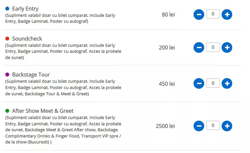 În timp ce Delia oferea mâncare și băutură luxury pentru 750 lei, cei de la BUG Mafia justifică prețul exorbitant astfel: intrarea direct în zona înscrisă pe bilet, fără a se mai sta la coadă, badge laminat, poster cu autograf, acces la probele de sunet, accesul în culise înainte și după show, mâncare și băutură, dar și transport VIP spre și de la show.