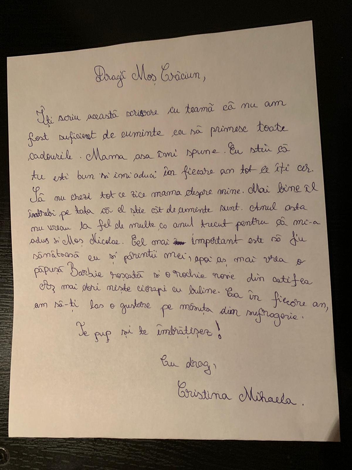 Îi cerea lui Moș Crăciun rochie roșie și ciorapi cu buline. Cum arată scrisoarea pe care Cristina Dorobanțu a trimis-o la 9 ani ?