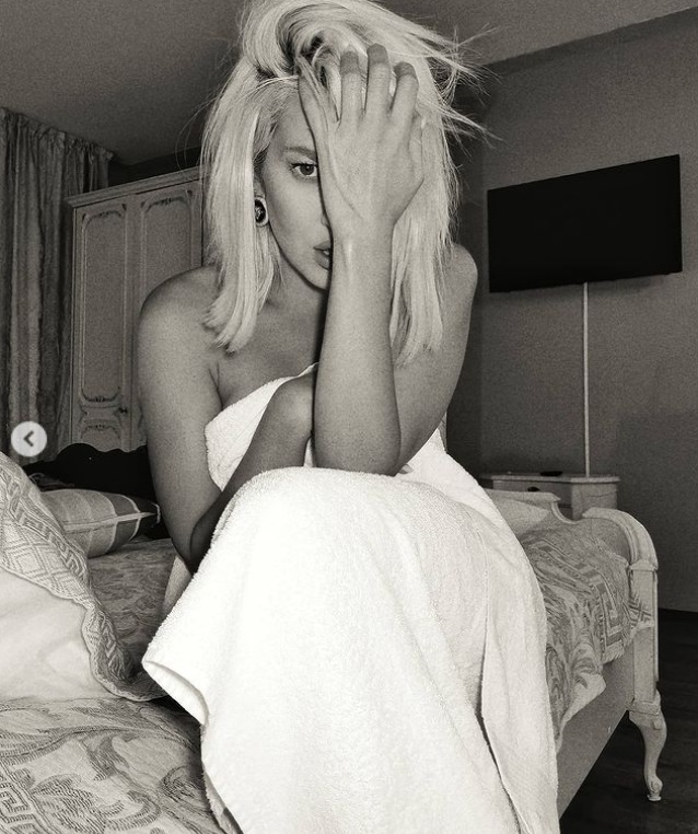 Lidia Buble s-a pozat în pat, în ipostaze provocatoare. S-a acoperit doar cu un prosop