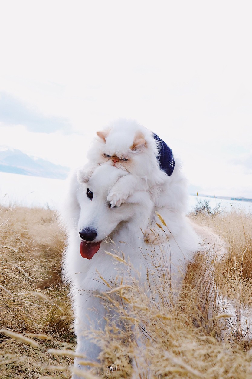 - (PICTURED Casper and Romeo enjoying the stunning New Zealand landscape) This adorable dog and grumpy cat are an unlikely duo but their owner says they are the best of friends - despite Romeo's face saying otherwise. Rinsa Li, 29, loves taking pictures of her two pets Casper, a six-year-old Samoyed pup, and Romeo, a two-year-old cat. The pair love spending time together, from cuddling up on the sofa to going on long walks around the country together. But despite the adorable relationship, Romeo can't get rid of his hilarious grumpy expression which leaves strangers in hysterics when they see him.,Image: 583343349, License: Rights-managed, Restrictions: It is not permitted to use or publish this image in a way which does not reflect a fair and true representation of the original context or in a manner which might be defamatory to any person or body or which is likely to bring the image Caters News or its licensees into disrepute., Model Release: no