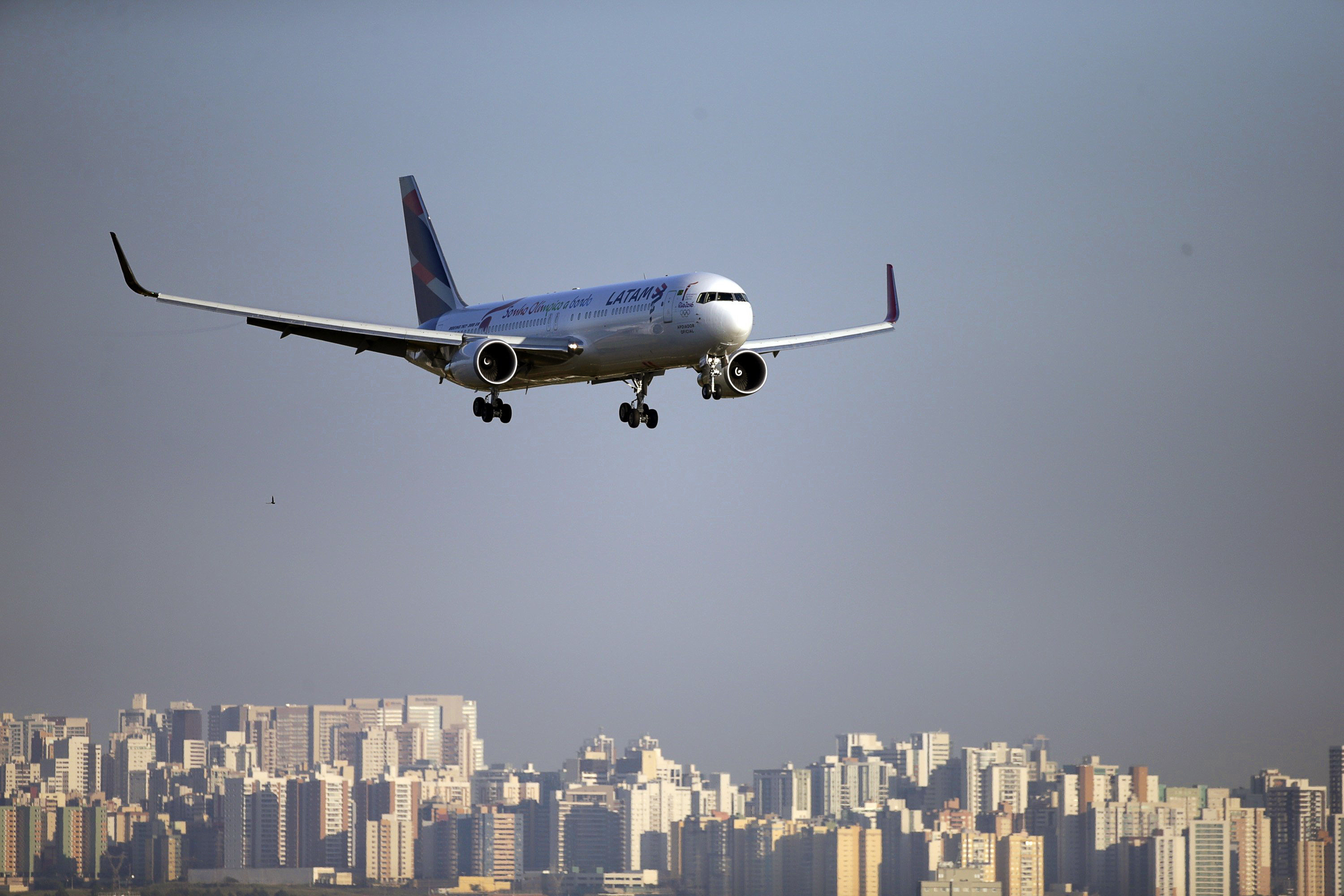A LATAM Airlines Group plane carrying the Olympic flame arrives at the airport of Brasilia, Brazil, 03 May 2016. The Olympic flame arrived to Brazil kicking off a three-month torch relay throughout the country that will finish at the Maracana stadium on 05 August 2016 with the opening ceremony of the Rio 2016 Olympic Games. EPA/FERNANDO BIZERRA