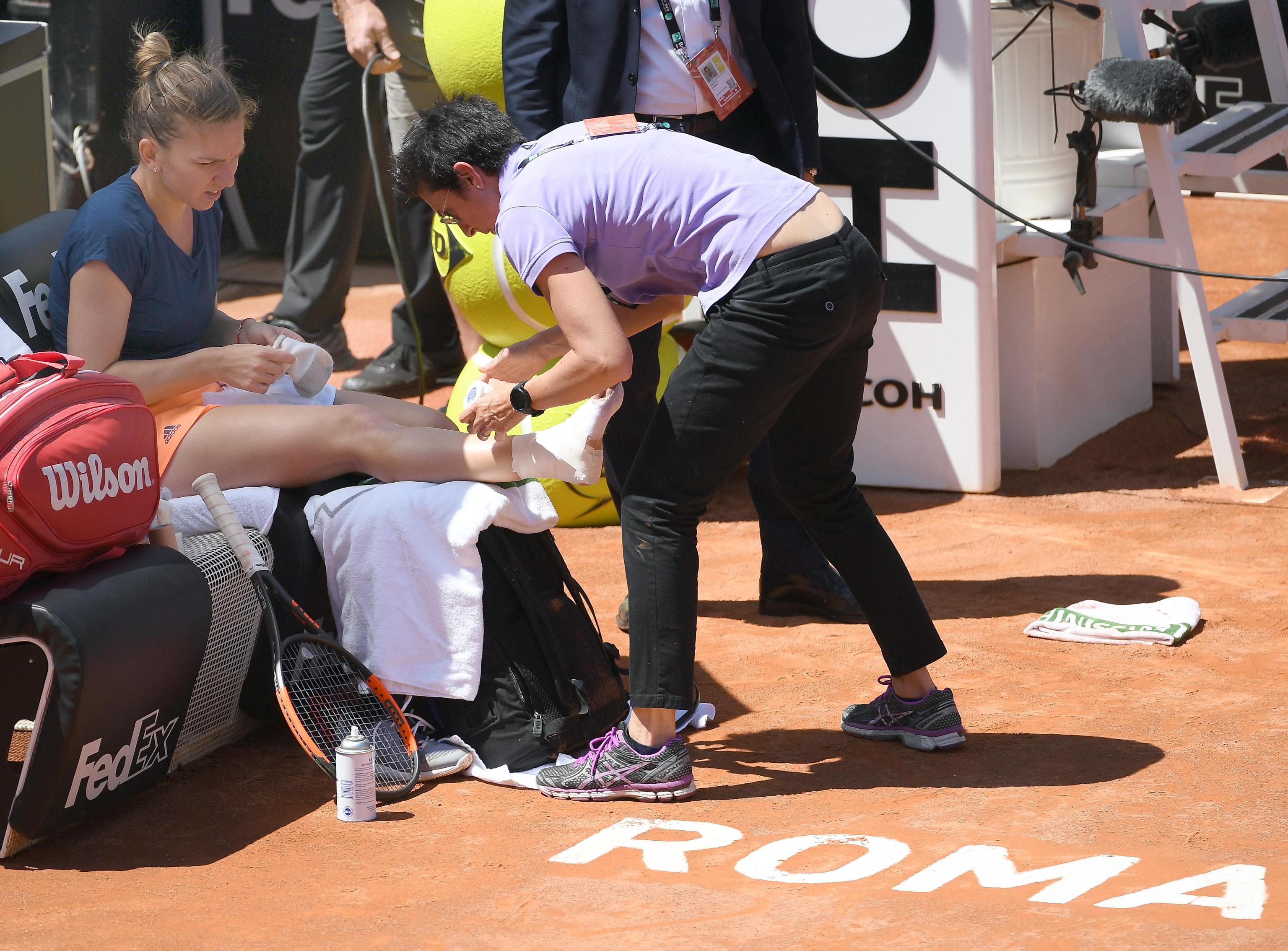 epa05978575 Simona Halep of Romania receives medical treatment during her final match against Elina Svitolina of Ukraine at the Italian Open Tennis Tournament, in the Central Stadium at the Foro Italico in Rome, Italy, 21 May 2017. EPA/CLAUDIO ONORATI