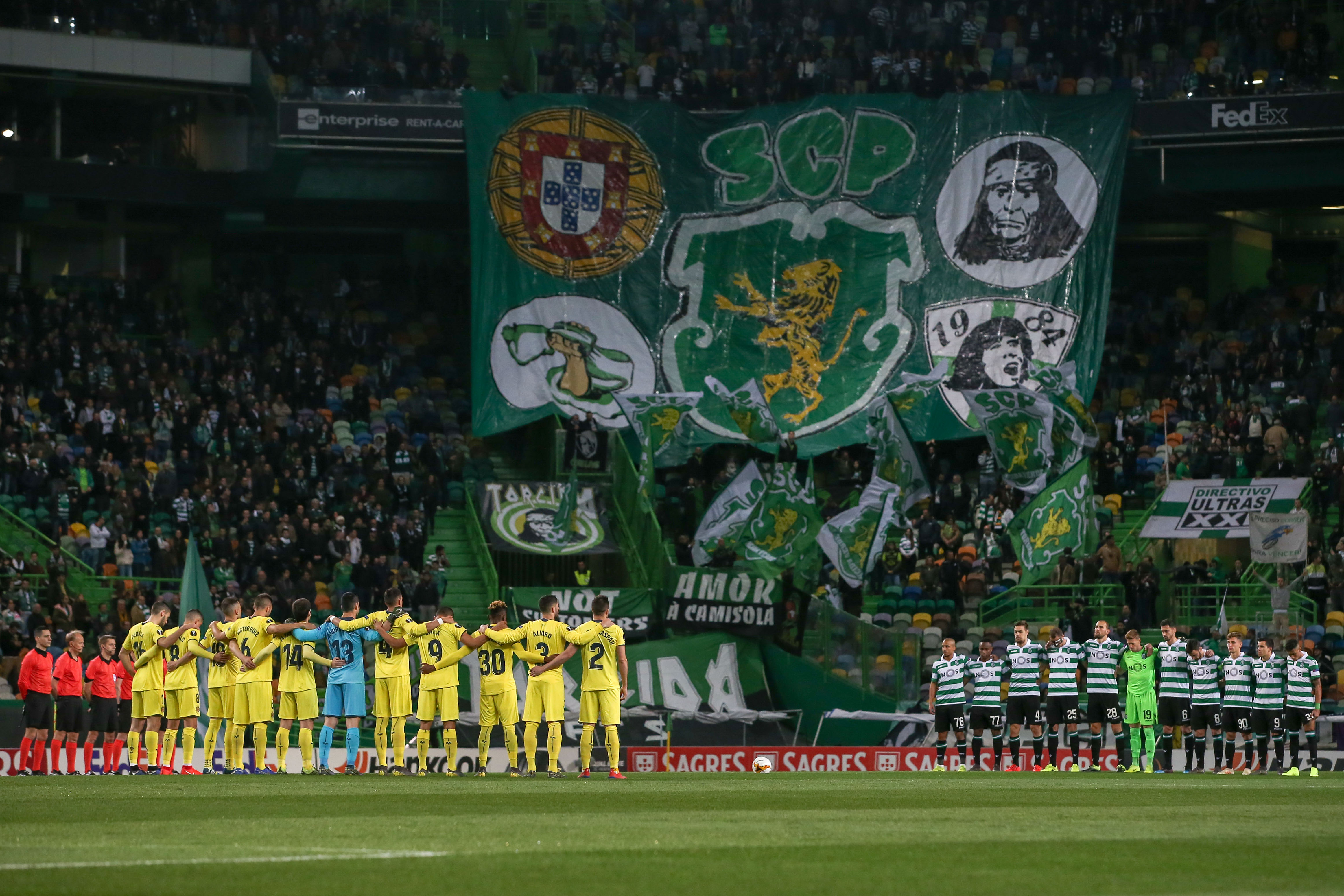 Sporting CP and Villareal CF players pay tribute to Argentinian player Emiliano Sala, who died in a plane accident, prior to their UEFA Europa League soccer Round of 32 first leg match between Sporting CP and Villarreal, at Alvalade Stadium, Lisbon, Portugal, 14 February 2019. EPA-EFE/JOSE SENA GOULAO
