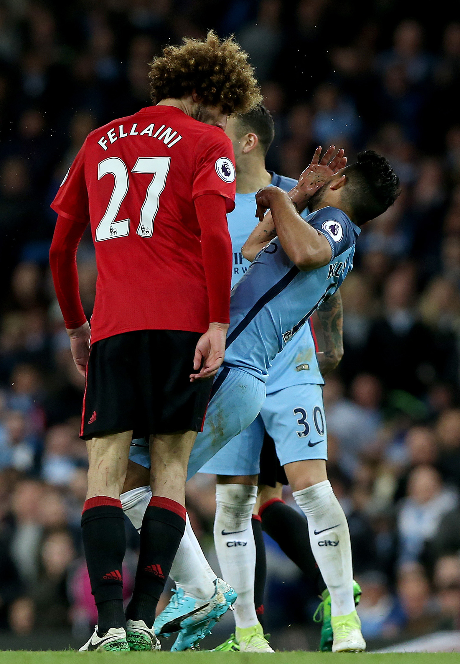 epa05931784 Manchester United's Marouane Fellaini (C) head butts Manchester City's Sergio Aguero during the English Premier League soccer match between Manchester City and Manchester United at the Etihad Stadium in Manchester, Britain, 27 April 2017. EPA/NIGEL RODDIS EDITORIAL USE ONLY. No use with unauthorized audio, video, data, fixture lists, club/league logos or 'live' services. Online in-match use limited to 75 images, no video emulation. No use in betting, games or single club/league/player publications