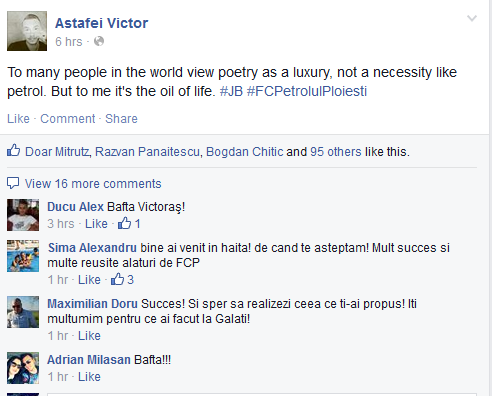 Astăzi, după ce transferul s-a oficializat, ”mușchetarul-poet” al Petrolului (n.r. – aluzie la look-ul mijlocașului care afișează o mustață precum a celebrilor mușchetari din romanul cu același nume al lui Alexandre Dumas) a postat pe pagina personală de Facebook un mesaj emoționant pentru fanii ”găzarilor” prin care își anunță dragostea pentru noua sa echipă: