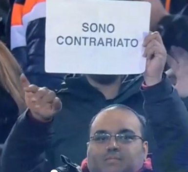 Suporterii și-au pierdut de mult răbdarea cu echipa capitolină. Iar la meciul cu AC Milan, de sâmbătă seară, au protestat în tăcere. Unul dintre ei, a făcut ceva în plus. A venit de-acasă cu o coală de hârtie pe care a scris, simplu: ”Sunt contrariat”. S-a întâmplat la jocul de pe ”Olimpico”, încheiat nedecis, scor 1-1. Omul a dat a lehamite din mână, semn că este sătul să tot audă scuzele jucătorilor.