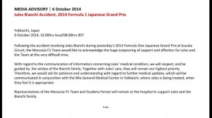 Anunţul mai spune că reprezentanţi ai Marussiei şi Ferrari sunt prezenţi şi vor rămâne la centrul medical Mie General din Yokkaichi, unde Bianchi este internat, pentru a-l susţine pe pilot.