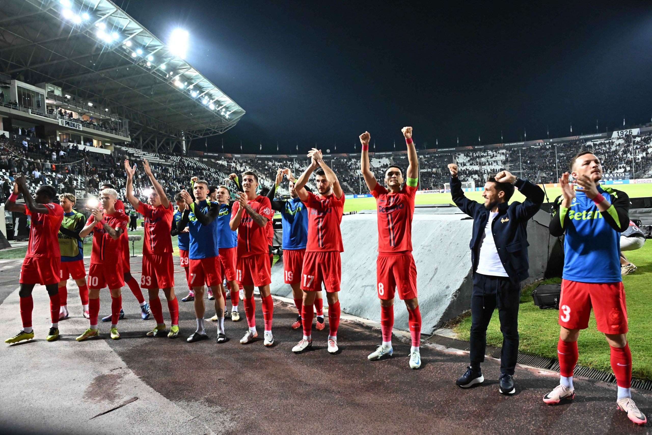 Fotbaliștii steliști Joyskim Aurelien Dawa Tchakonte, Octavian George Popescu, Risto Radunovic, Florin Lucian Tănase, David Raul Miculescu, Mihai Popescu, Adrian Gheorghe Șut, Alexandru Mihail Baluță si Ionuț Constantin Panțîru salută galeria după meciul dintre PAOK Salonic si FCSB, din cadrul UEFA Europa League, desfasurat pe Stadionul Toumba din Salonic, joi 3 octombrie 2024. © FOTO:Razvan Pasarica/SPORT PICTURES