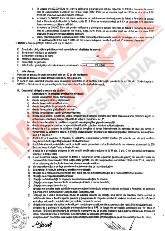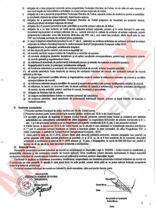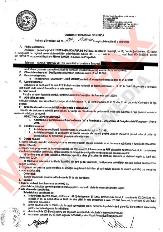 Agenţia Mediafax a intrat în posesia unor documente din care reiese că, pentru a-şi rezilia contractul de selecţioner, Victor Piţurcă trebuie să plătească o despăgubire mult mai mare de 500.000 de euro, aşa cum s-a vehiculat până acum. Concret, suma se ridică la 1,425 de milioane de euro! Mai mult, data scadentă a contractului lui Piţi este 30 noiembrie 2016, şi nu sfârşitul preliminariilor pentru Euro 2016, aşa cum se ştia până acum.