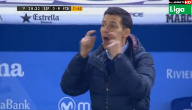 Minutul 30. După o acțiune de atac eșuată a lui Espanyol, Costel Gâlcă a ieșit la marginea terenului și le-a cerut elevilor săi, cu gesturi limpezi, să se uite după colegi, înainte de a pasa. Cu puțin timp înainte, Messi îi dăduse din nou de lucru lui Bardi.