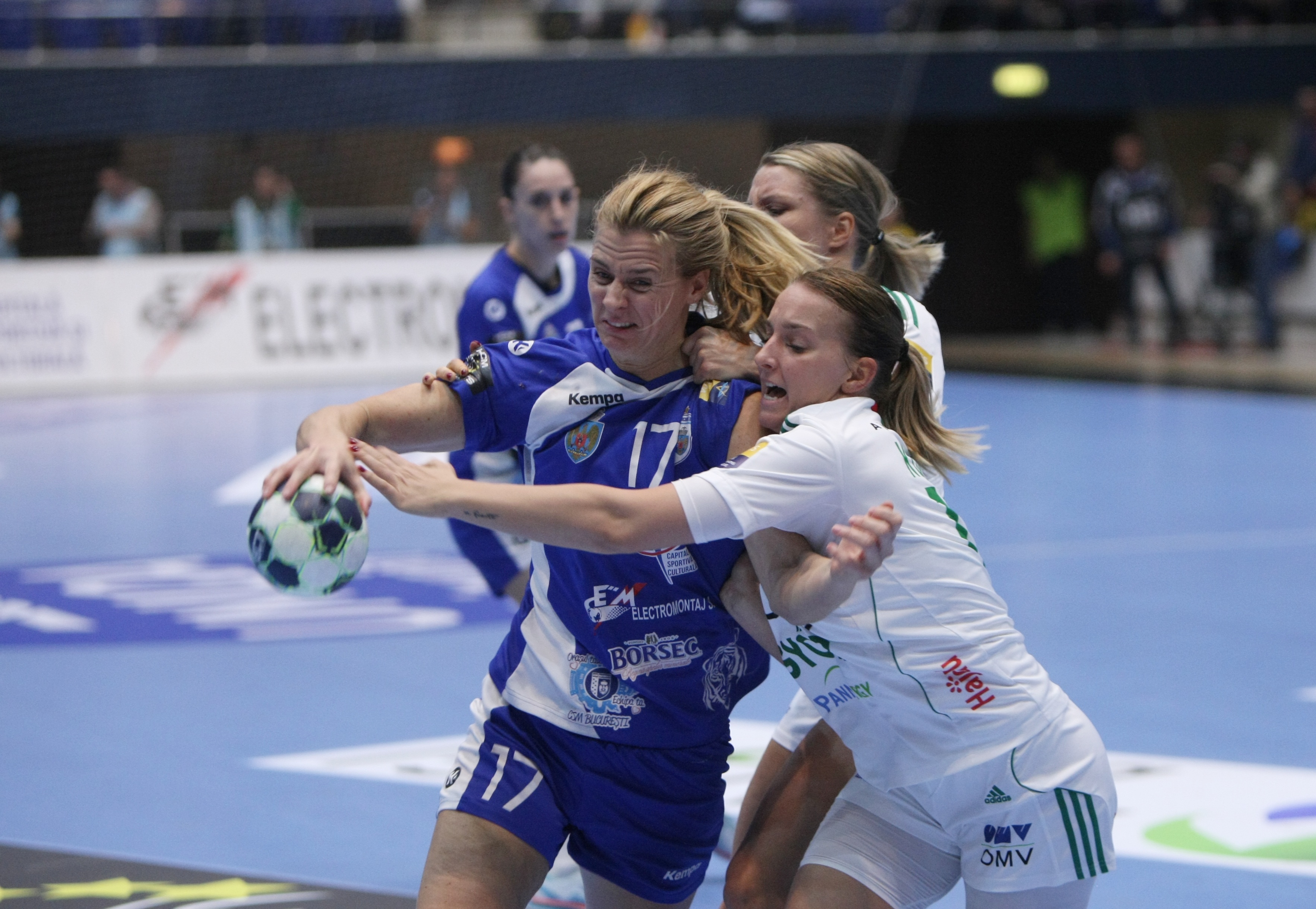 Oana Manea (la minge) n-a avut prea mult succes în fața apărării celor de la Gyor FOTO: Vlad Chirea