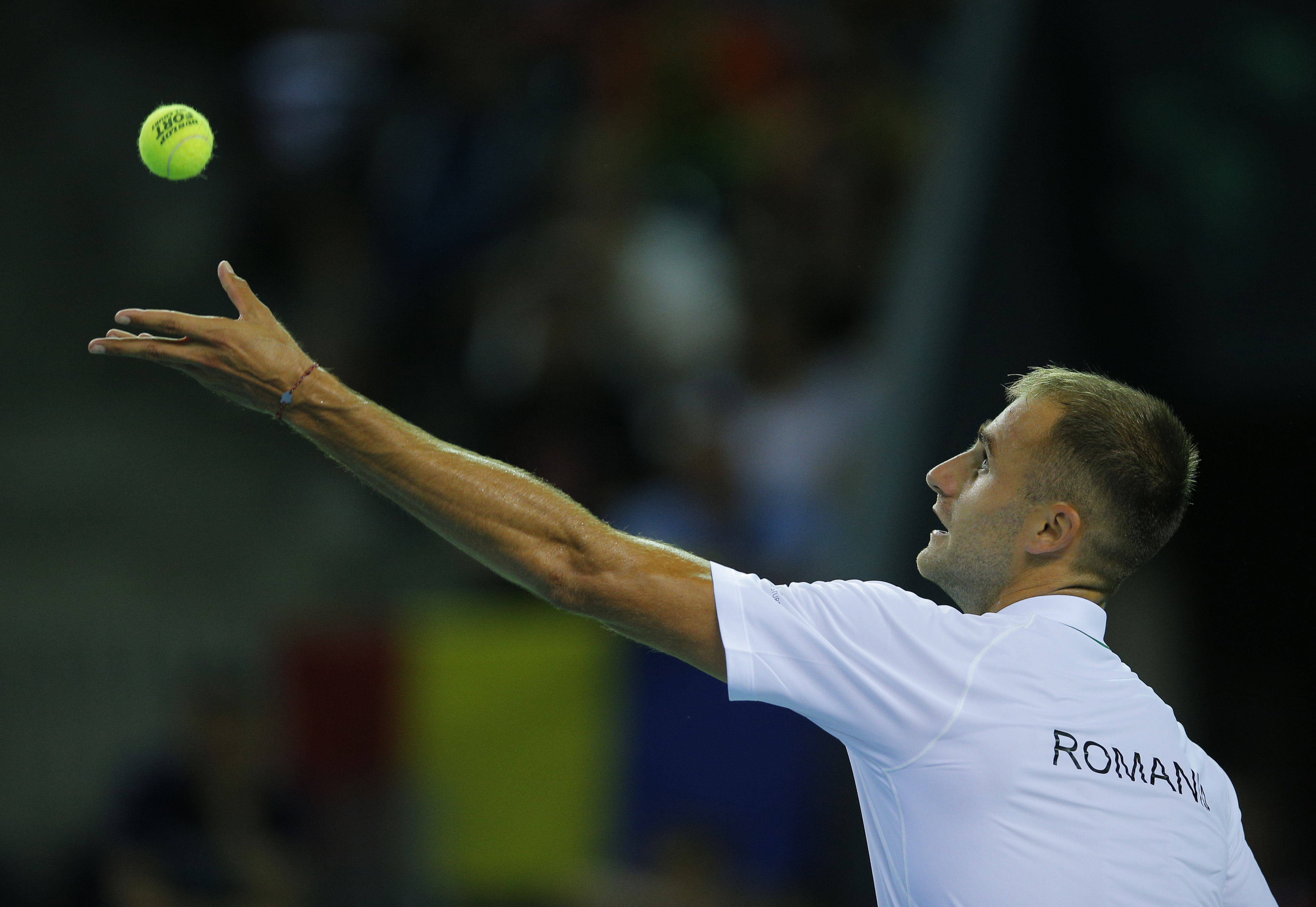 epa05426041 Romania's Marius Copil in action against Spain's Feliciano Lopez during their match for the Davis Cup group I tie between Romania and Spain at Polivalenta Soprts Hall in Cluj city, western Romania, 15 July 2016. EPA/ROBERT GHEMENT