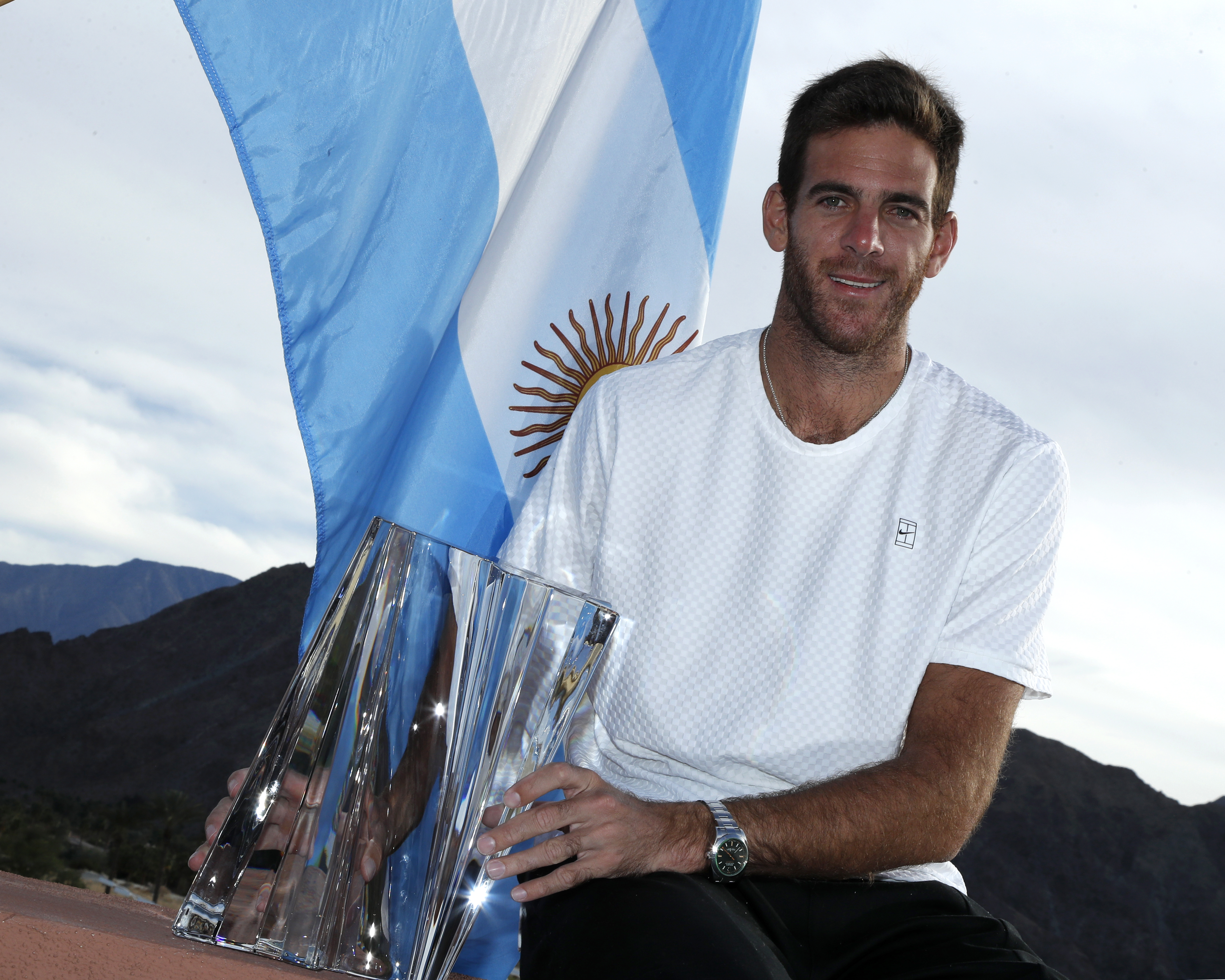 epa06613554 Juan Martin Del Potro of Argentina poses with the trophy after defeating Roger Federer of Switzerland in their BNP Paribas Open teenis tournament men's final match at the Indian Wells Tennis Garden in Indian Wells, California, USA, 18 March 2018. EPA-EFE/PAUL BUCK