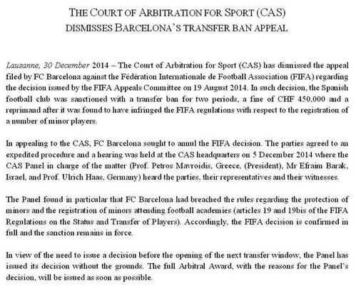 Oficialii s-au mai adresat UEFA pentru a primi acordul să realizeze măcar un transfer în această iarnă, în ciuda interdicţiei. Catalanii sperau să poată lua un înlocuitor pentru Thomas Vermaelen, după ce belgianul a suferit o nouă accidentare. Echipa “blaugrana” a primit răspuns negativ de la Tribunalul de Arbitraj Sportiv de la Lausanne (TAS), astfel că nu va putea efectua niciun transfer în această iarnă și nici în vară.