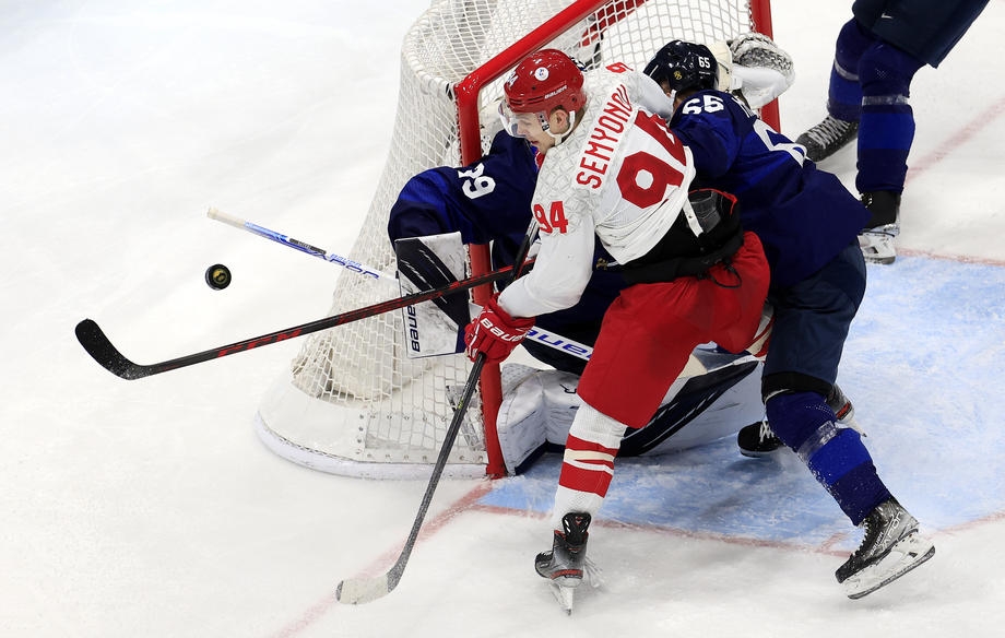 epa09773728 Kirill Semyonov of Russia attacks the goal of Finnish goalkeeper Harri Sateri during the Men's Ice Hockey gold medal match between Finland and the Russian Olympic Committee at the Beijing 2022 Olympic Games, Beijing, China, 20 February 2022. Finland won 2-1. EPA-EFE/ALEX PLAVEVSKI