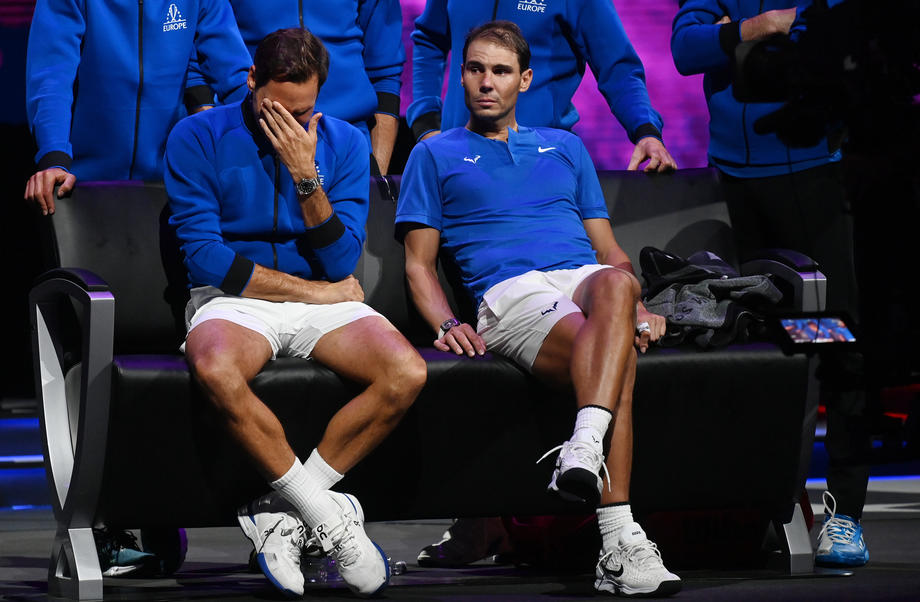 epa10202789 Team Europe player Roger Federer (L) of Switzerland sitting next to doubles partner Rafael Nadal of Spain after losing their match against Team World double Jack Sock of the US and Frances Tiafoe of the US on the first day of the Laver Cup tennis tournament in London, Britain, 23 September 2022. The match was Federer's last game before retirement. EPA-EFE/ANDY RAIN
