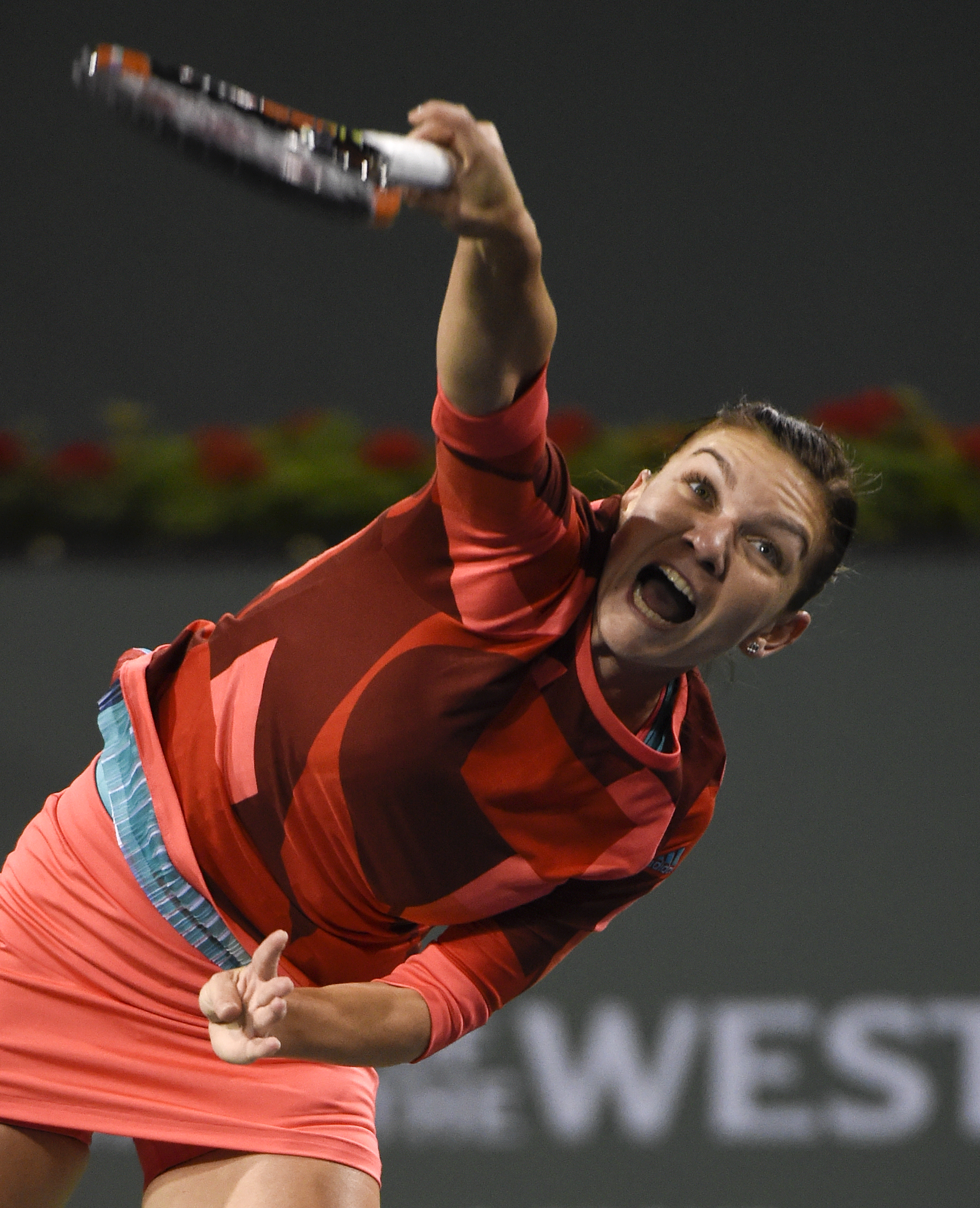 epa05207161 Simona Halep of Romania reacts after winning a point against the Vania King of the USA during their second round match at the BNP Paribas Open in Indian Wells, California, USA, 11 March 2016. EPA/RAY ACEVEDO