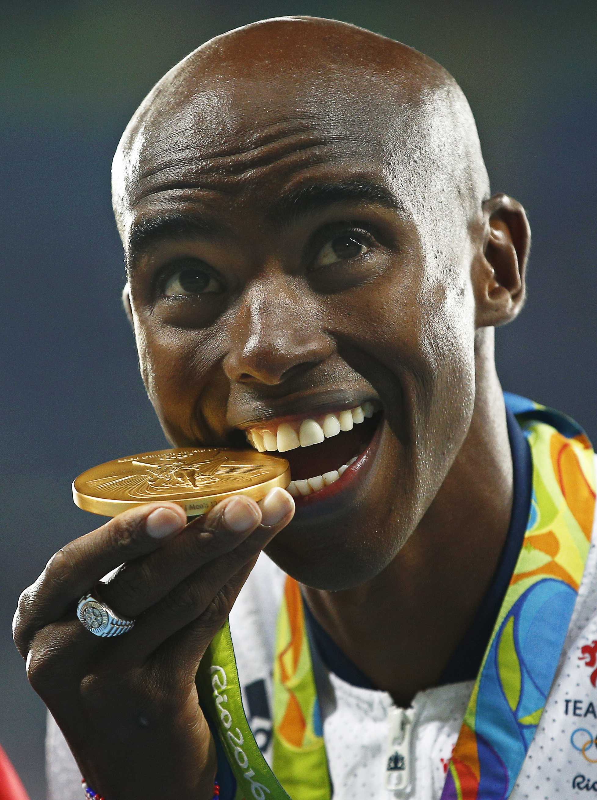 epa05482682 Mo Farah of Britain poses with his gold medal on the podium after winning the men's 10000m final of the Rio 2016 Olympic Games Athletics, Track and Field events at the Olympic Stadium in Rio de Janeiro, Brazil, 13 August 2016. EPA/YOAN VALAT