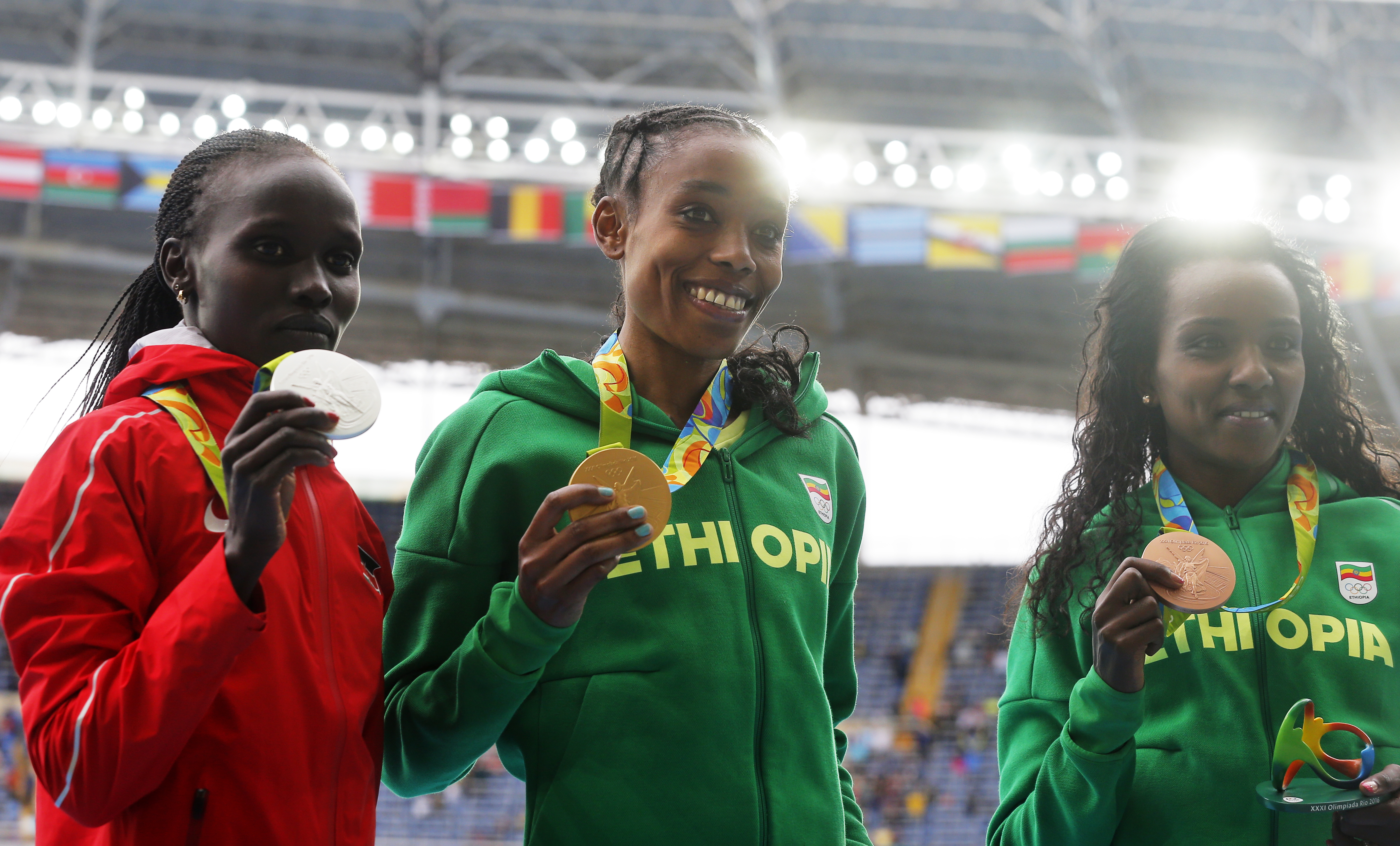 epa05477117 (from left) Silver medalist Vivian Jepkemoi Cheruiyot of Kenya, gold medalist Almaz Ayana of Ethiopia and bronze medalist Tirunesh Dibaba of Ethiopia during the medal ceremony for the women's 10000m final of the Rio 2016 Olympic Games Athletics, Track and Field events at the Olympic Stadium in Rio de Janeiro, Brazil, 12 August 2016. EPA/SERGEI ILNITSKY