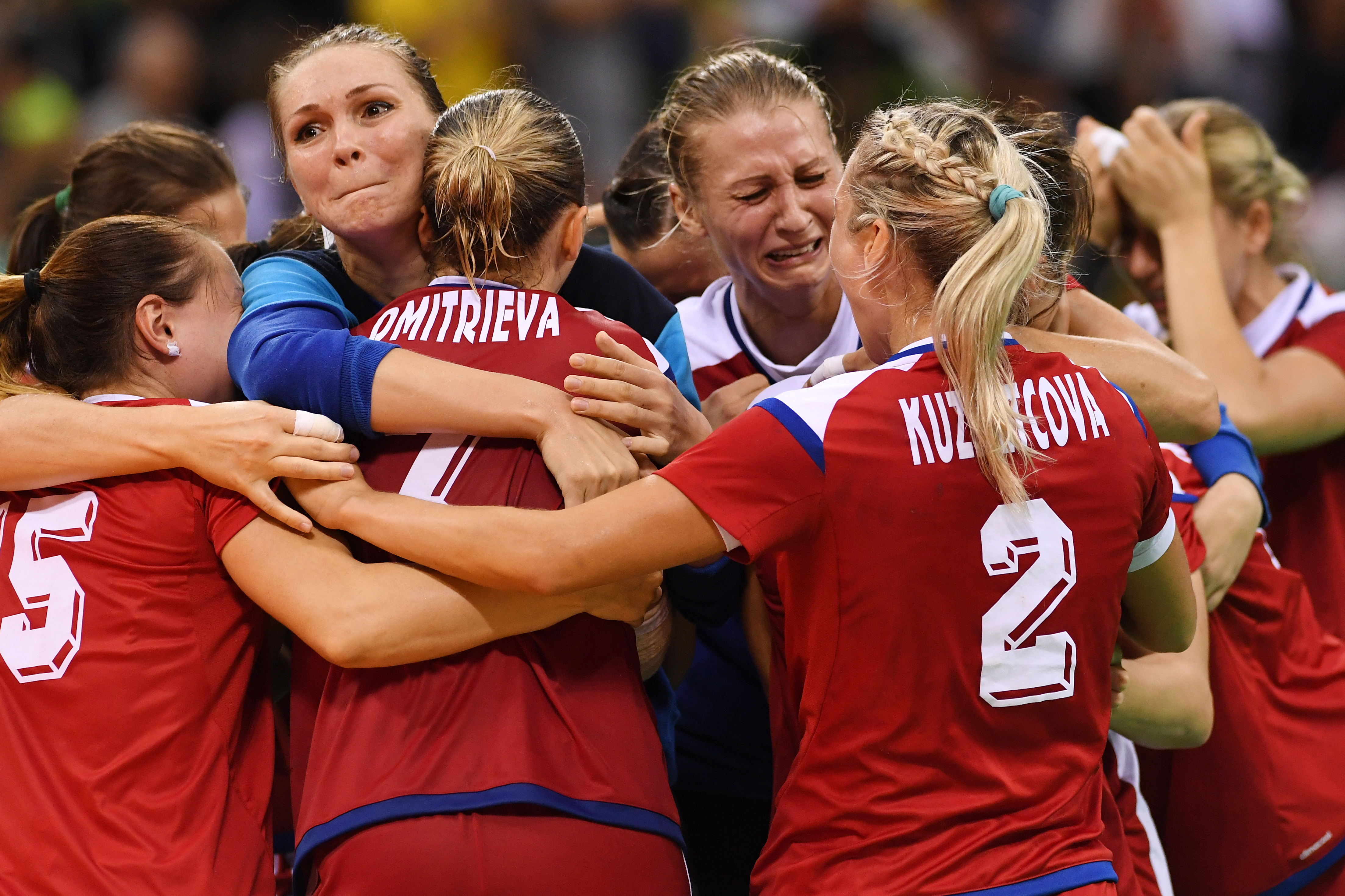 epa05498209 Players of Russia celebrate their win in the women's semifinal Handball match between Norway and Russia of the Rio 2016 Olympic Games at the Future Arena in the Olympic Park in Rio de Janeiro, Brazil, 18 August 2016. EPA/MARIJAN MURAT