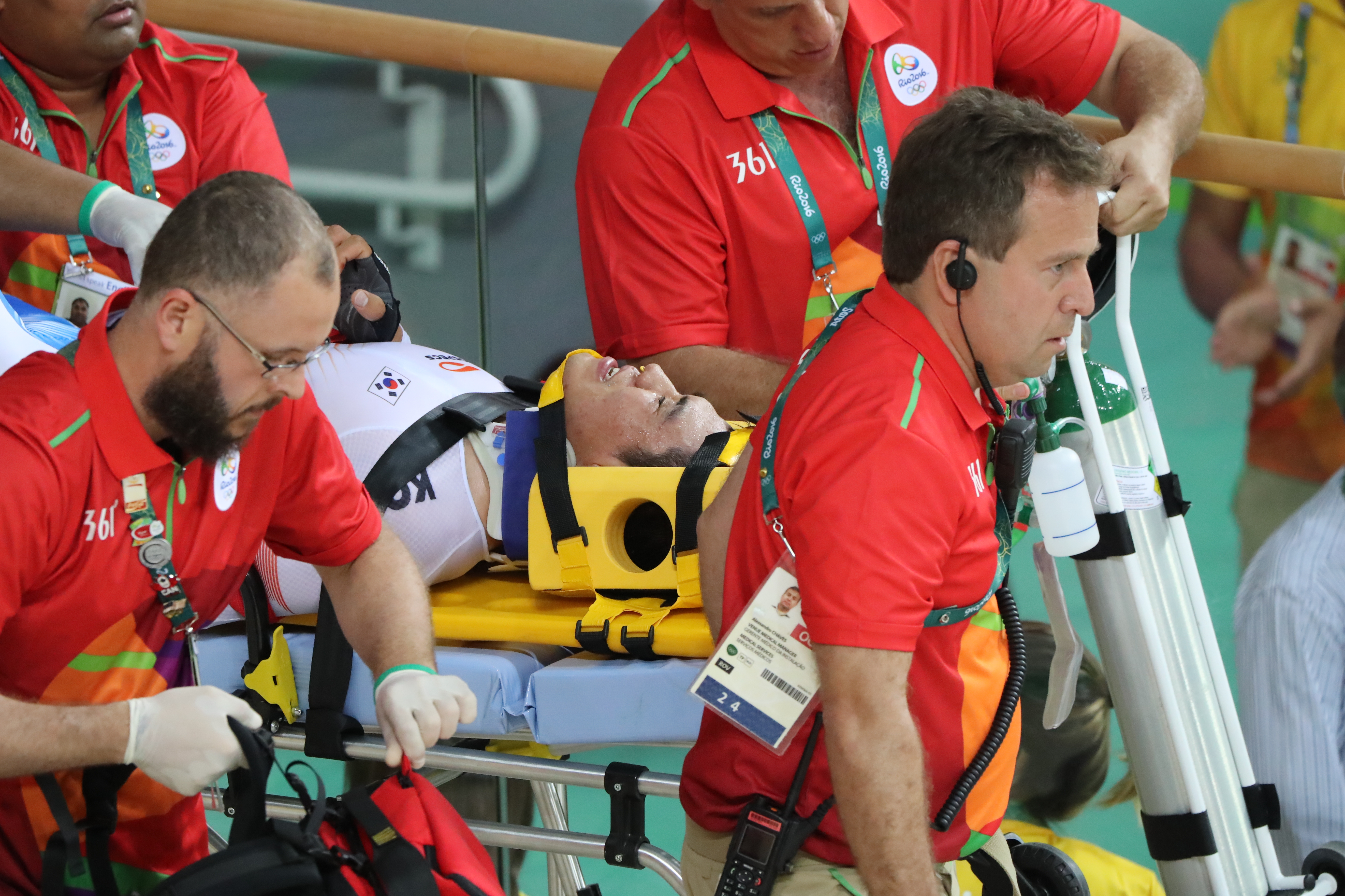 epa05487939 Sanghoon Park (C) of South Korea received medical treatment after a crash during the Men's Omnium Points race track cycling event at the Velodrome in the Olympic Park in Rio de Janeiro, Brazil, 15 August 2016. EPA/ALEJANDRO ERNESTO