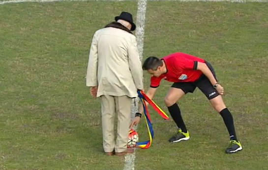 Lovitura de start a fost dată de către un veteran de război, care are 91 de ani. ”Centralul” Cristi Balaj i-a ținut mingea, ca să poată șuta, având în vedere vântul care bătea.