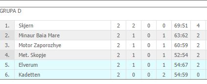 Astfel, după două etape în grupa D, Skjern are 4 puncte, iar celelalte formații câte 2 puncte, cu excepţia celor de la Kadetten, care se află pe ultimul loc, fără niciun punct. Băimărenii au cel mai bun golaveraj.