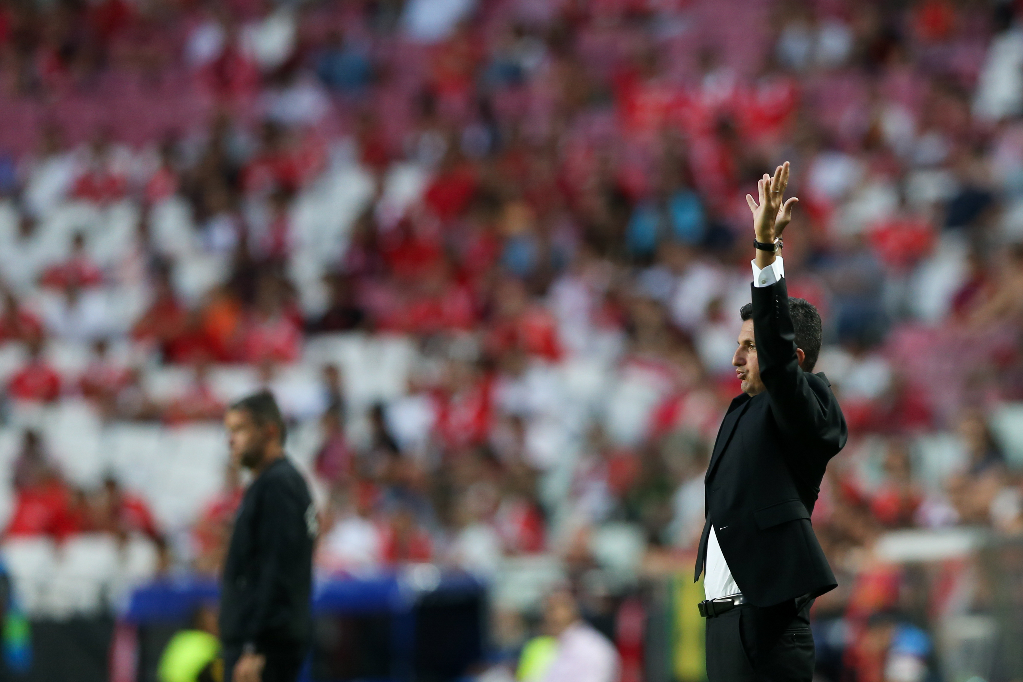 Paok´s FC head coach, Razvan Lucescu, reacts during their UEFA Champions League playoff first leg soccer match at Luz Stadium, Lisbon, Portugal, 21 August 2018