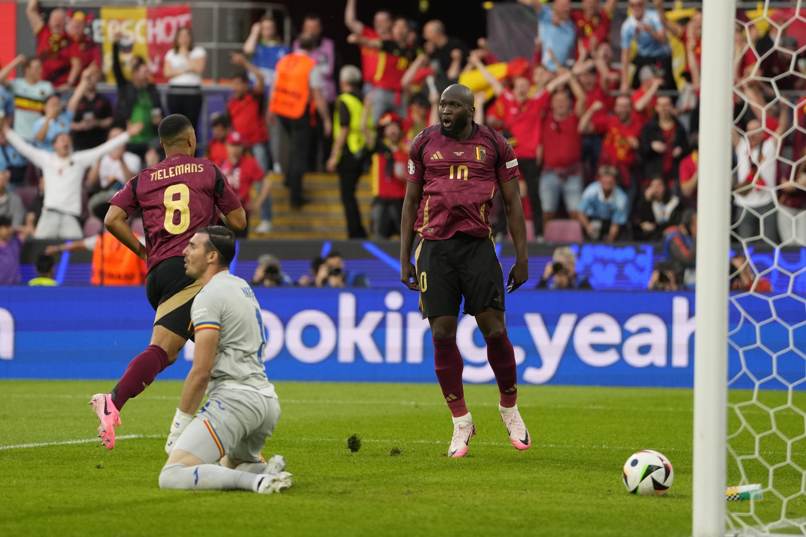 Belgium's Youri Tielemans (8) is congratulated by Romelu Lukaku after scoring his side's opening goal during a Group E match between Belgium and Romania at the Euro 2024 soccer tournament in Cologne, Germany, Saturday, June 22, 2024.,Image: 883916170, License: Rights-managed, Restrictions: This content is intended for editorial use only. For other uses, additional clearances may be required., Model Release: no, Pictured: Romelu Lukaku,Youri Tielemans