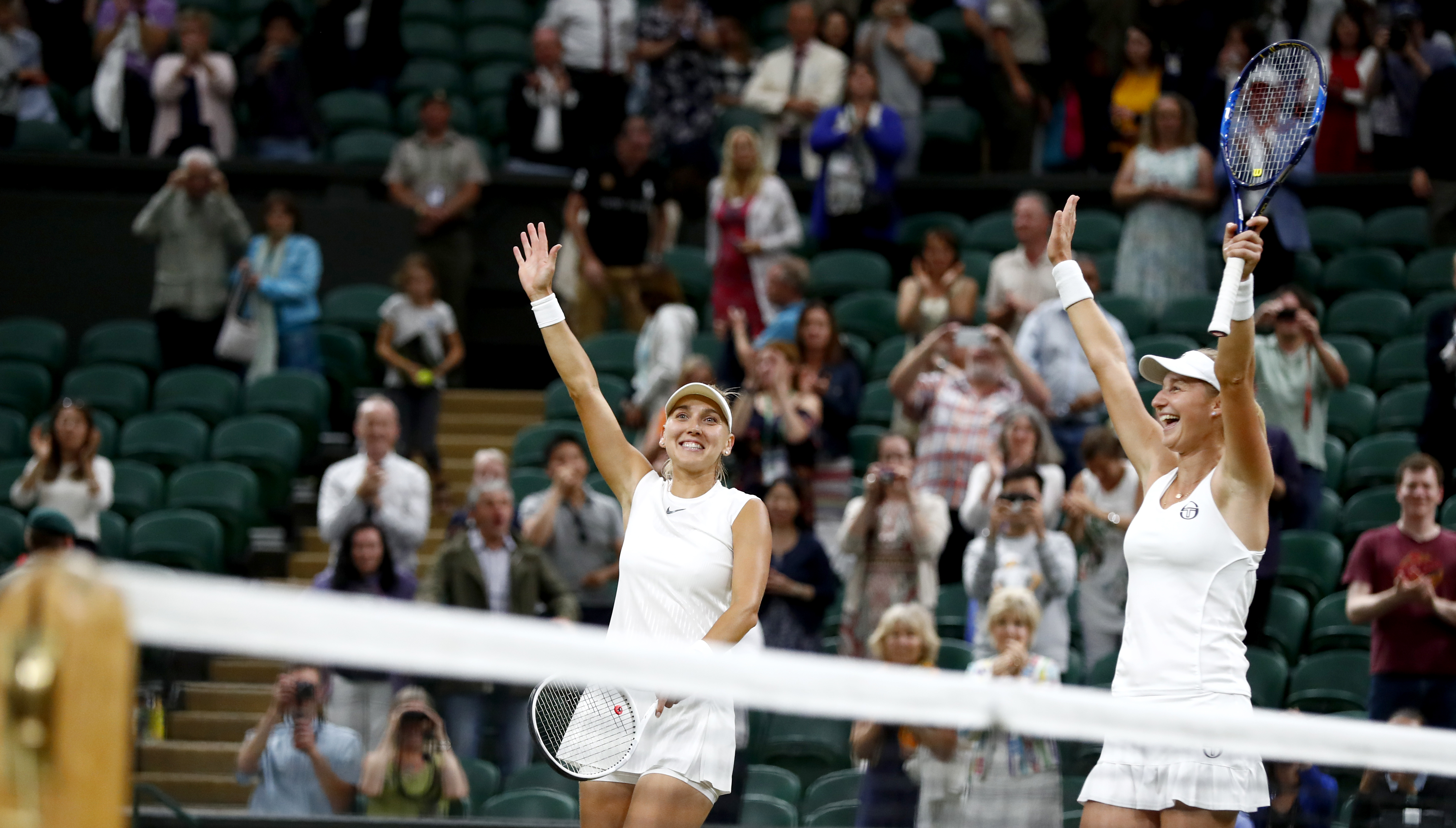 epa06090280 Elena Vesnina (L) of Russia and Ekaterina Makarova of Russia celebrate winning against Monica Niculescu of Romania and Hao-Ching Chan of Taiwan during their Women's Doubles final match for the Wimbledon Championships at the All England Lawn Tennis Club, in London, Britain, 15 July 2017. EPA/NIC BOTHMA EDITORIAL USE ONLY/NO COMMERCIAL SALES