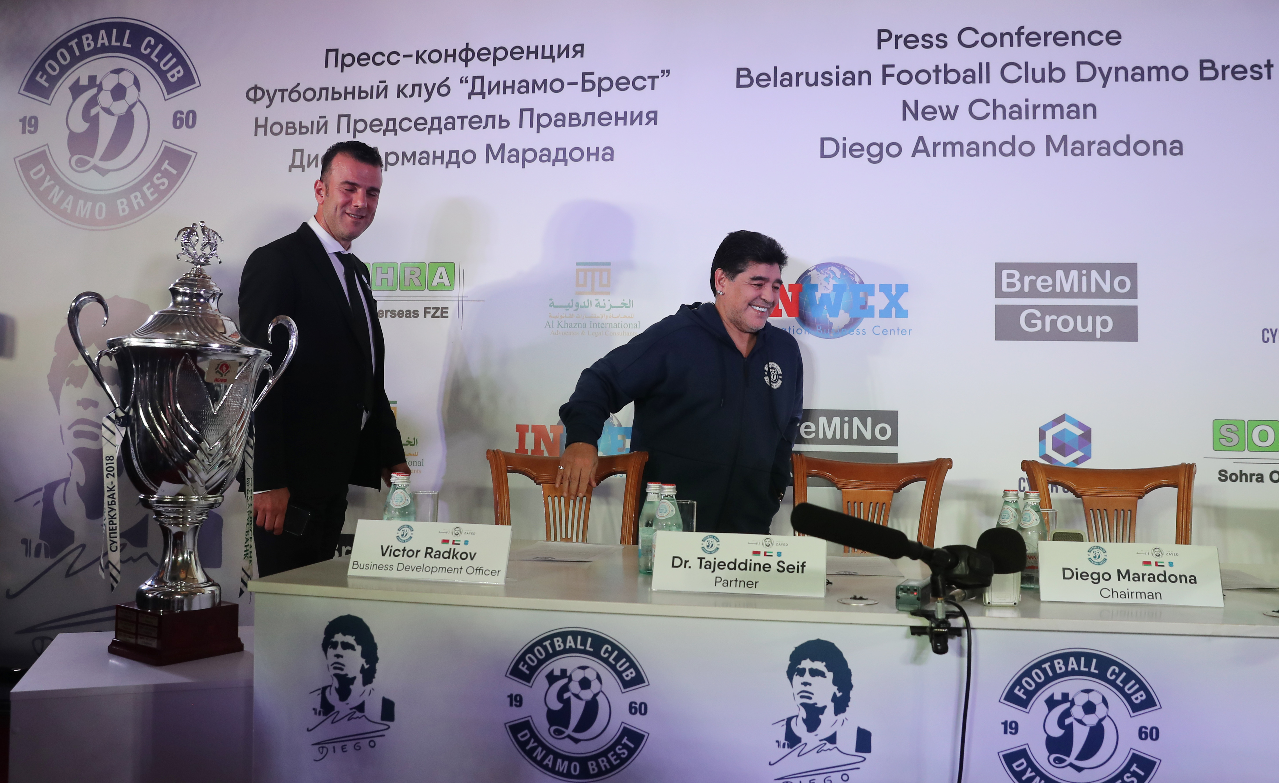 epa06893324 Argentinian soccer legend Diego Maradona (R) attends a press conference in Brest, Belarus, 16 July 2018. Maradona has been appointed as chairman of Belarussian soccer club 'Dinamo Brest'. EPA-EFE/TATYANA ZENKOVICH