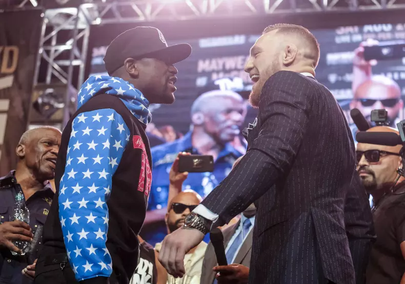 epa06165768 Conor McGregor (L) of Ireland in action against Floyd Mayweather (R) of the US during their fight at the T-Mobile Arena in Las Vegas, Nevada, USA, 26 August 2017. EPA-EFE/ARMANDO ARORIZO
