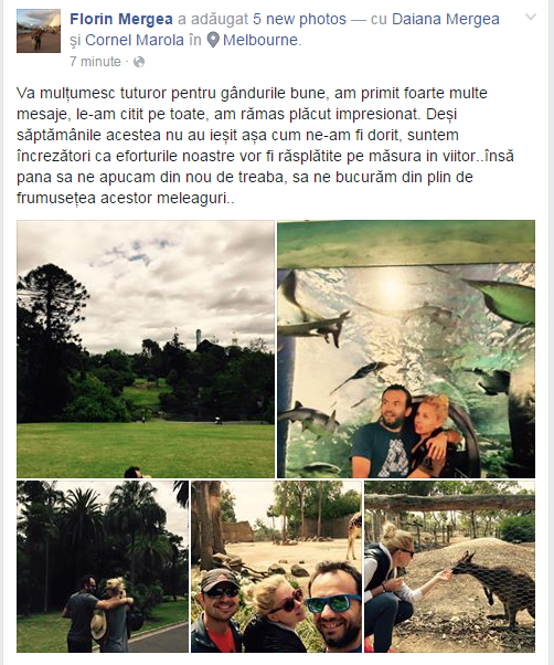 ”Va mulțumesc tuturor pentru gândurile bune, am primit foarte multe mesaje, le-am citit pe toate, am rămas plăcut impresionat. Deși săptămânile acestea nu au ieșit așa cum ne-am fi dorit, suntem încrezători ca eforturile noastre vor fi răsplătite pe măsura in viitor..însă pana sa ne apucam din nou de treaba, sa ne bucurăm din plin de frumusețea acestor meleaguri..”.