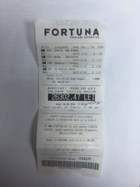 Iată biletul curajos, care a avut o miză de 3.333,33 lei la o cotă de 7,89, câştigul sărind de 26.000 de lei!