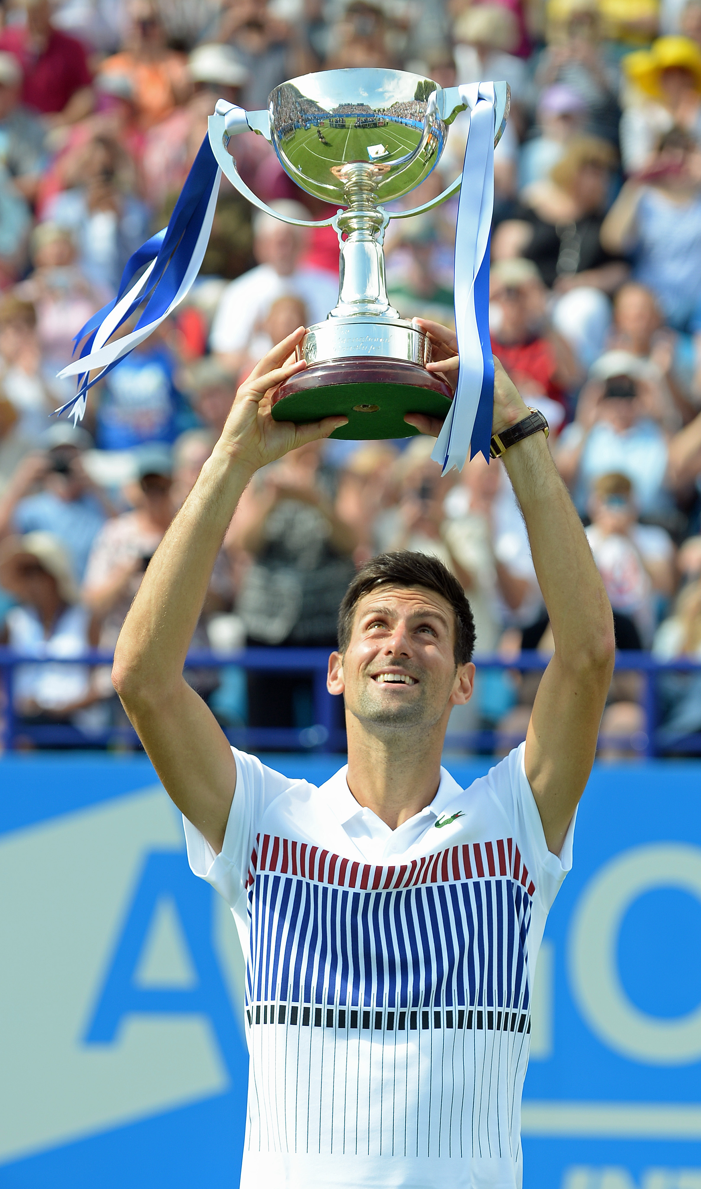 epa06059921 Novak Djokovic of Serbia lifts the cup after beating Gael Monfils of France in the final match at the Aegon International tennis tournament in Eastbourne, Britain, 01 July 2017. EPA/GERRY PENNY