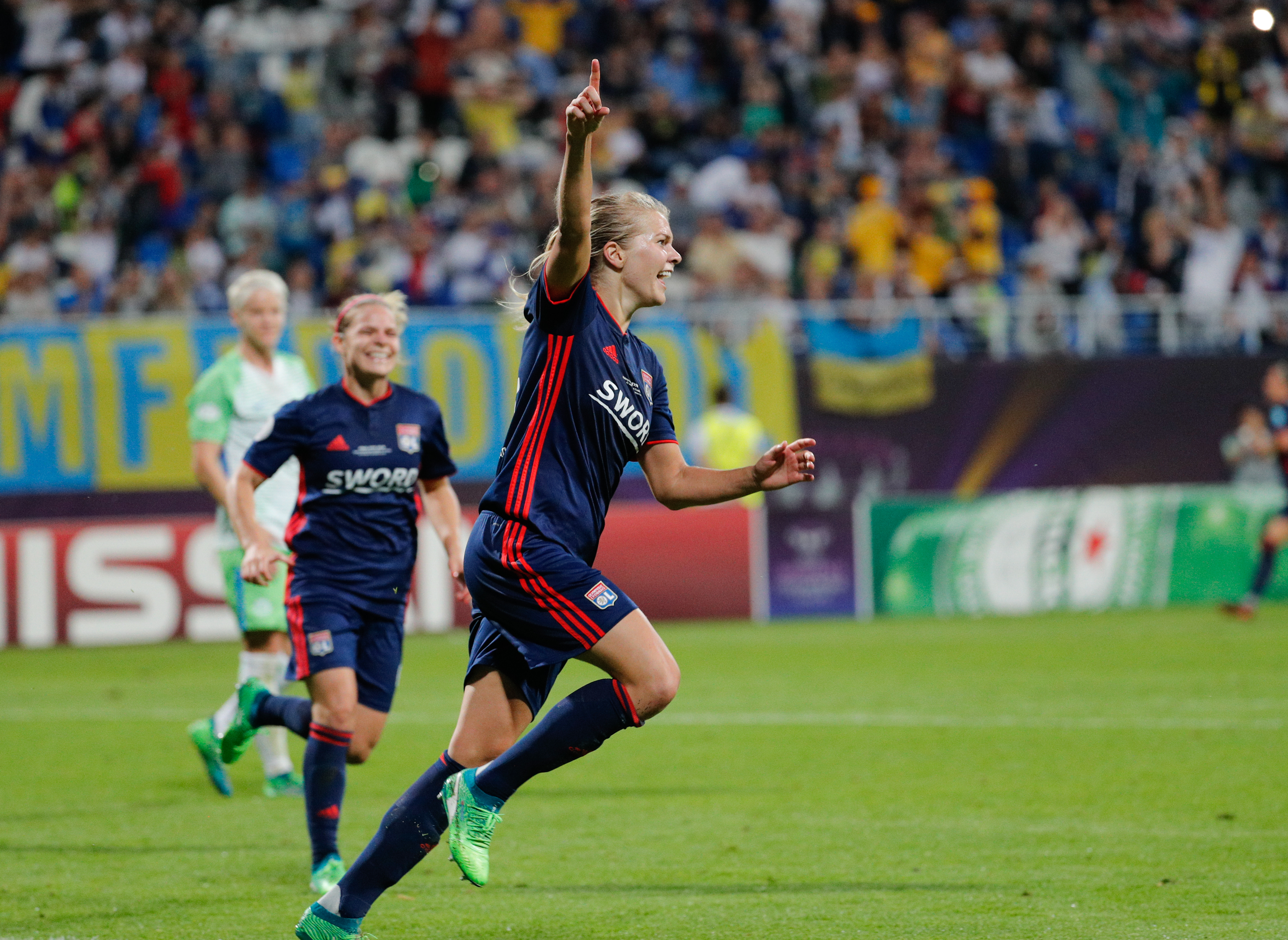 epa06761026 Ada Hegerberg (R) of Lyon celebrates with teammates after scoring the 3-1 during the UEFA Women's Champions League final between Wolfsburg and Lyon in Kiev, Ukraine, 24 May 2018. EPA-EFE/SERGEY DOLZHENKO