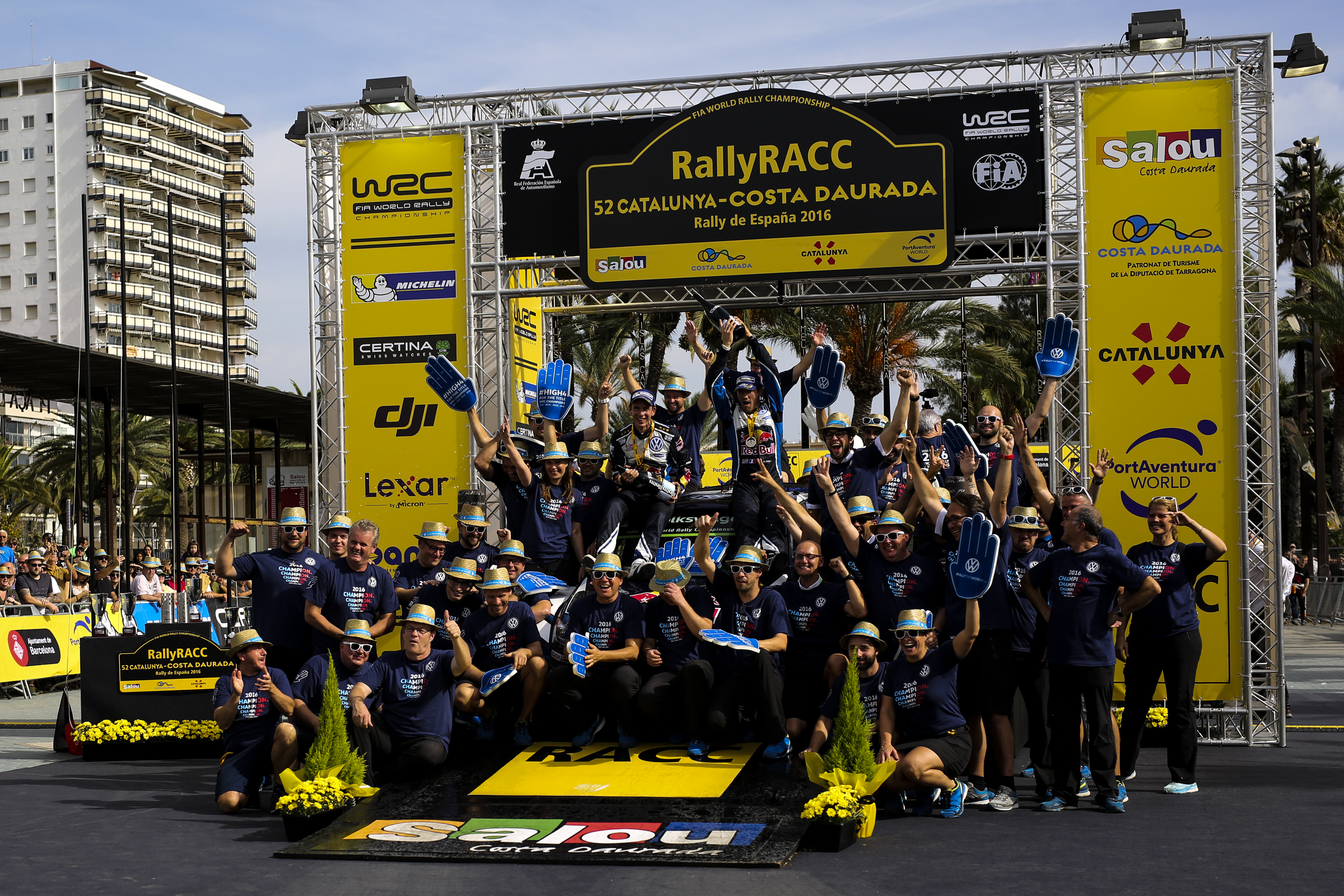 epa05588148 French driver Sebastien Ogier and his co-driver Julien Ingrassia of Volkswagen Motorsport team (C) celebrate after winning the Rally Catalunya - Rally de Espana 2016 in Salou, Tarragona, northeastern Spain 16 October 2016. EPA/STR