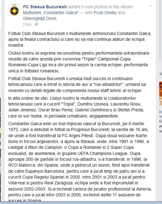 Clubul le-a mulţumit printr-un comunicat pe Facebook şi colaboratorilor lui Gâlcă, deşi toţi mai au contracte valabile pe un sezon cu Steaua!