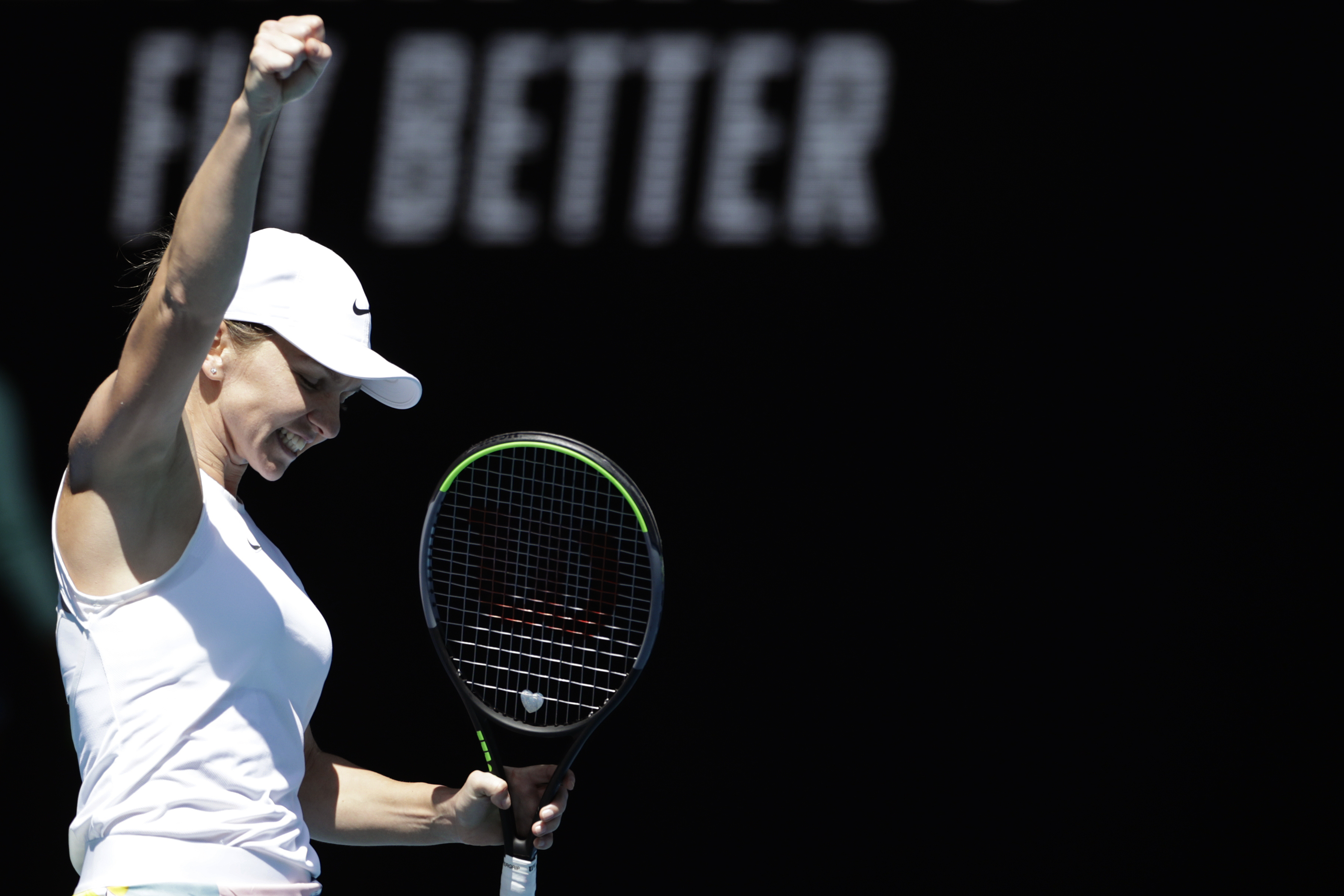 epa08174036 Simona Halep of Romania celebrates winning against Anett Kontaveit of Estonia during a Women's Singles quarter-final match on day 10 of the Australian Open tennis tournament at Melbourne Park in Melbourne, Australia, 29 January 2020. EPA-EFE/LUKAS COCH EDITORIAL USE ONLY AUSTRALIA AND NEW ZEALAND OUT