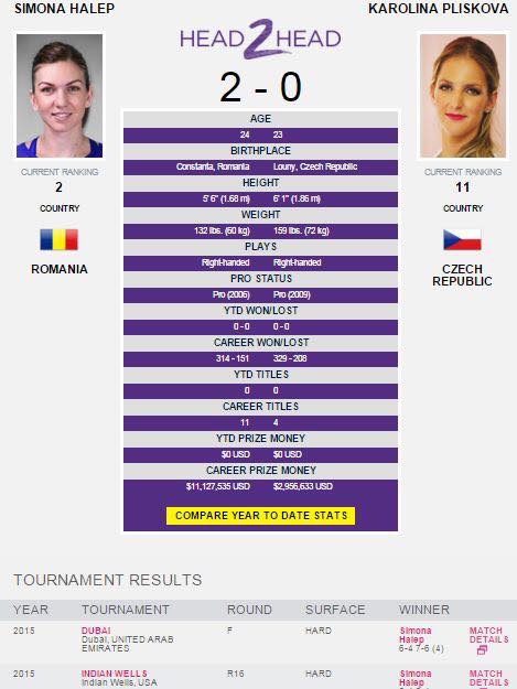 Câștigătoarea din acest meci o va înfrunta, joi, pe rusoaica Svetlana Kuznețova, care a trecut cu 7-6 (1), 6-0 de Sara Errani (Italia), revenind de la 1-5, în primul set. Halep o conduce cu 3-2 pe rusoaică, la general.