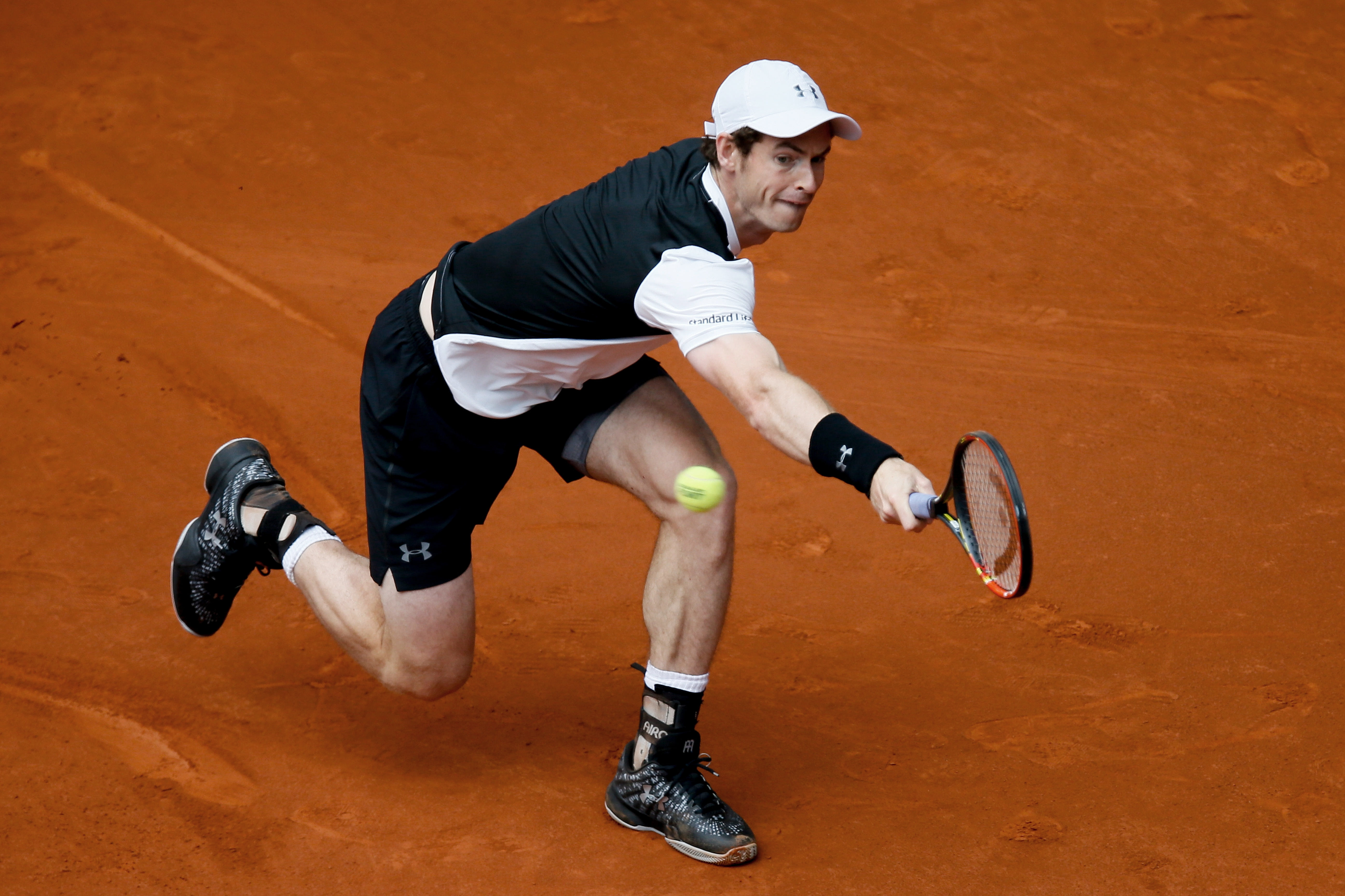 epa05293131 British tennis player Andy Murray hits the ball against Spaniard Rafael Nadal during their Mutua Madrid Open semifinals match played at Caja Magica tennis complex in Madrid, Spain, on 07 May 2016. EPA/JuanJo Martin