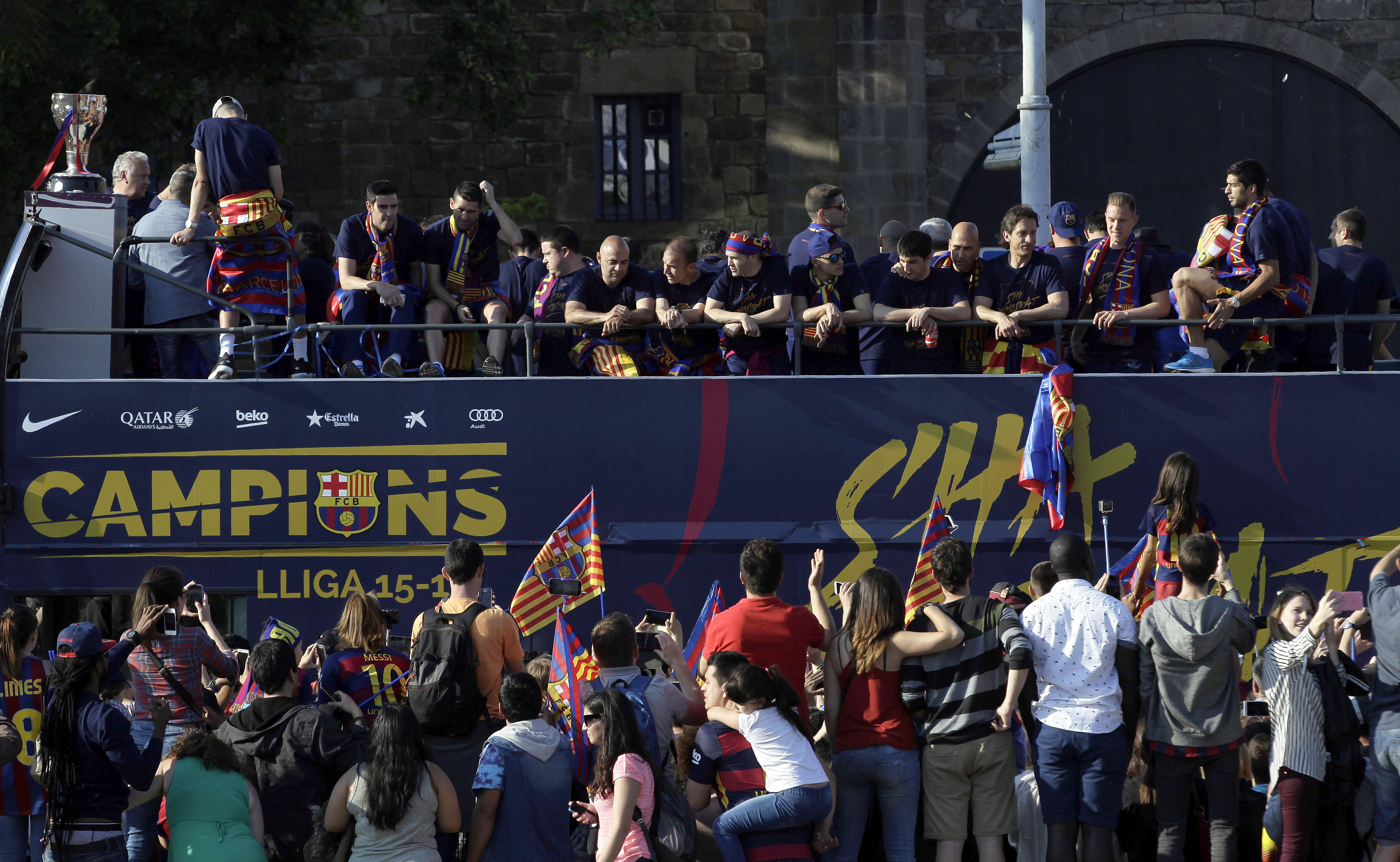 epa05308299 Barcelona FC players celebrate their Liga title on a bus as supporters cheer in Barcelona, Spain, on 15 May 2016. Barcelona FC won the 2015/2016 Spanish Liga followed by Real Madrid and Atletico de Madrid. EPA/ALBERTO ETEVEZ