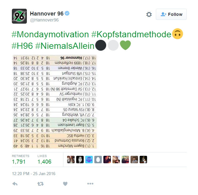 Concret, pe contul oficial de Twitter al lui Hannover 96 a fost postat astăzi clasamentul Bundesligii, dar nu normal, ci cu susul în jos. În acest fel, echipa nu mai e “lanternă roșie”, ci lider!