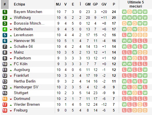 Clasamentul Bundesligii după etapa a 10-a: