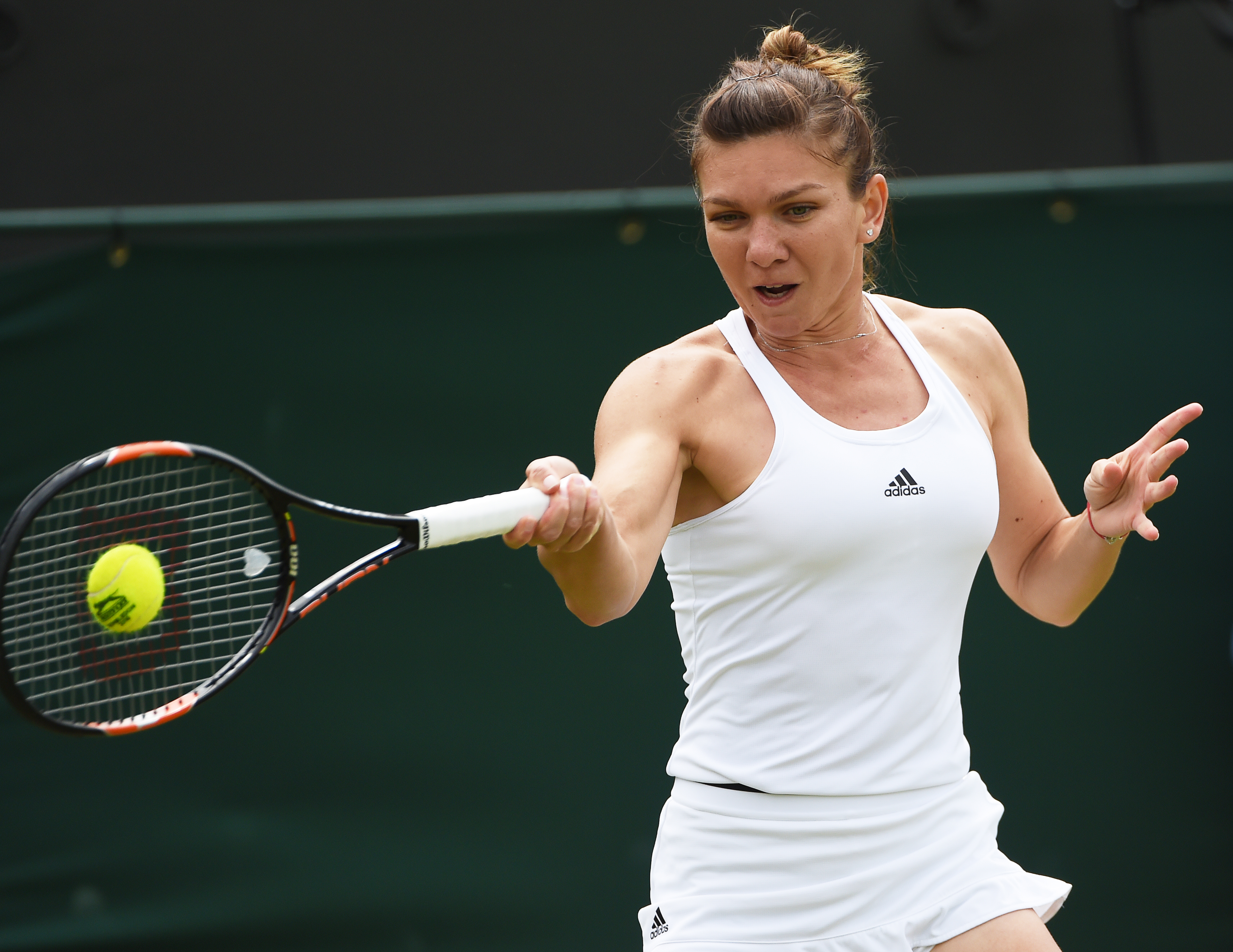epa05398735 Simona Halep of Romania returns to Francesca Schiavone of Italy in their second round match during the Wimbledon Championships at the All England Lawn Tennis Club, in London, Britain, 30 June 2016. EPA/FACUNDO ARRIZABALAGA EDITORIAL USE ONLY/NO COMMERCIAL SALES