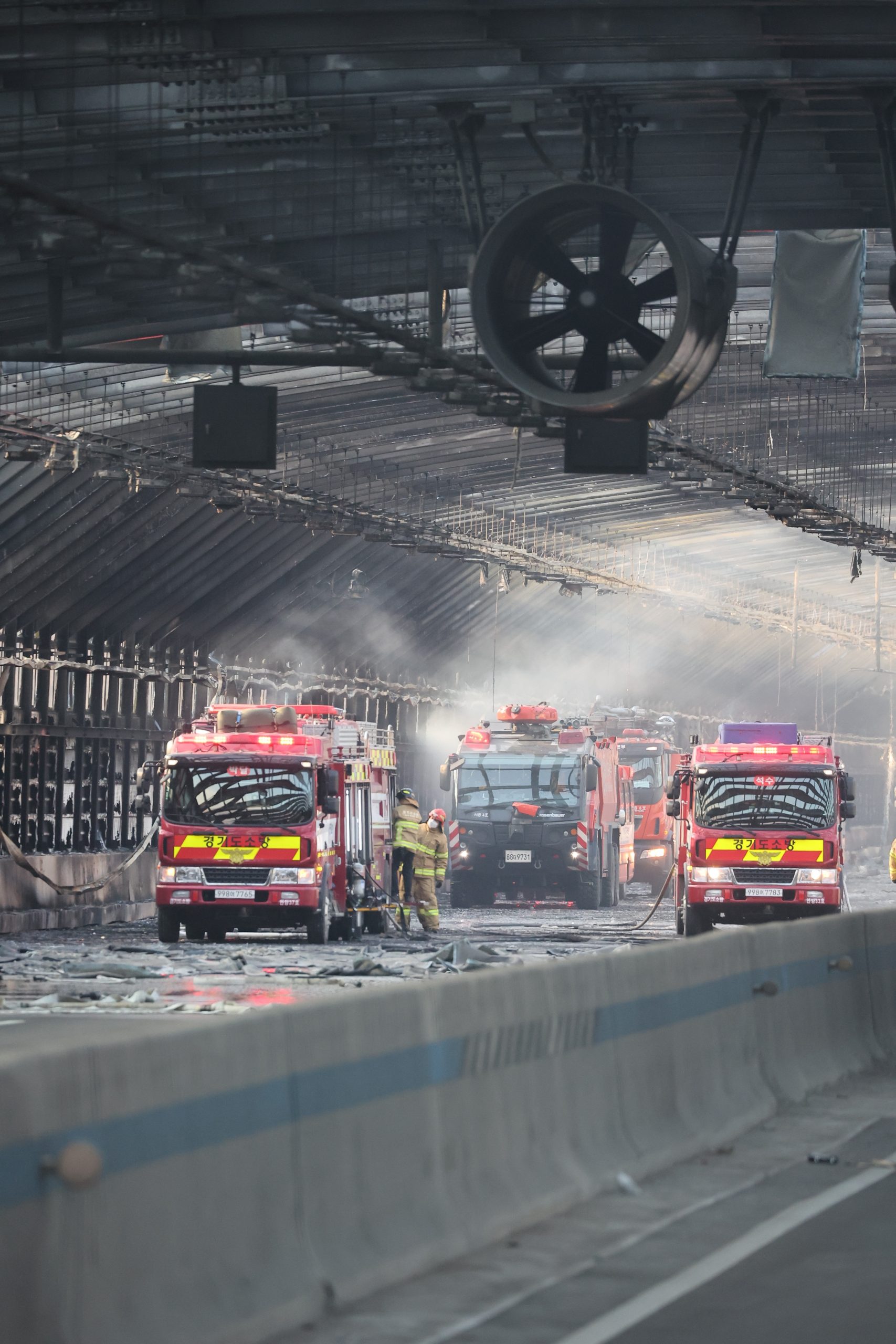 epa10381097 Firefighters battle a fire inside a noise barrier tunnel on an expressway in Gwacheon, South Korea, 29 December 2022. At least six people were found dead and 20 others injured in the fire that broke out at 1:49 p.m. inside the tunnel, fire authorities said. EPA-EFE/YONHAP SOUTH KOREA OUT