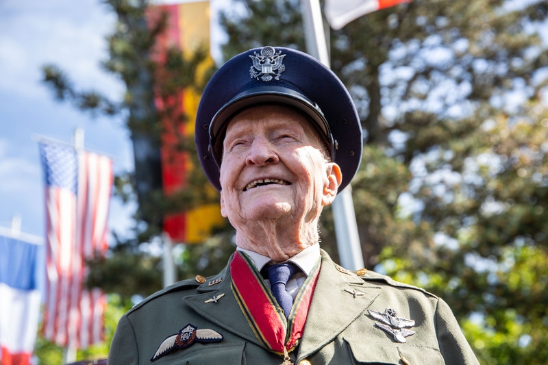 epa07638856 Former US pilot Colonel Gail Seymour 'Hal' Halvorsen (C), also known as 'Berlin Candy Bomber' attends the 70th anniversary celebrations of the Berlin Airlift at the Clay Kaserne in Wiesbaden, Germany, 10 June 2019. The Berlin Blockade took place from 1948 to 1949 during the Cold War. Western Allies planes called 'raisin bombers' (Rosinenbomber) carried supplies to the people of West Berlin. EPA-EFE/JOERG HALISCH