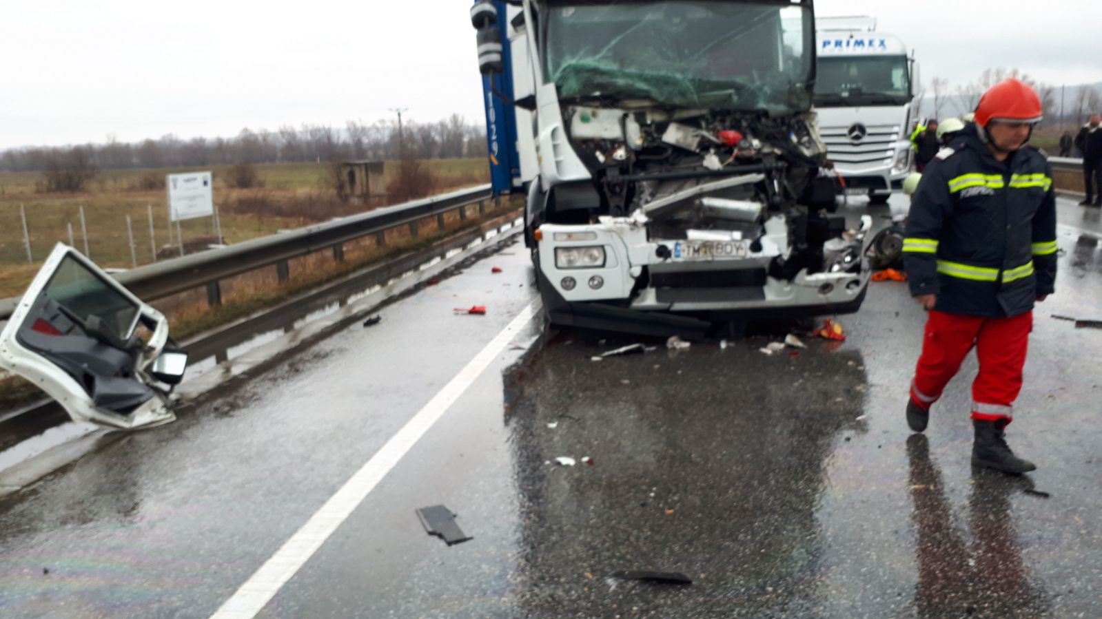 Accident cu trei tiruri pe șoseaua de centură a orașului Lugoj. Un șofer a rămas încarcerat/ FOTO